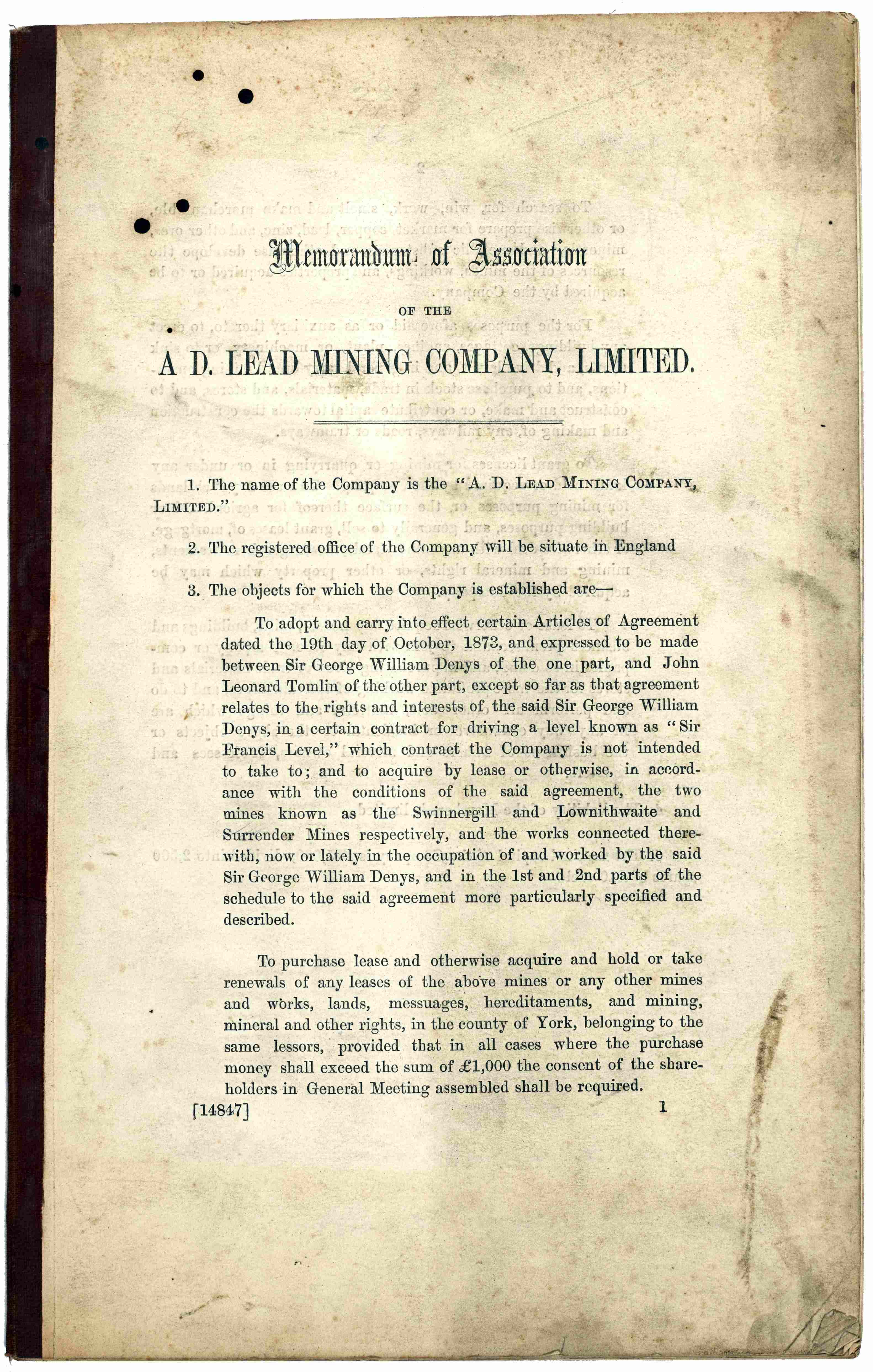 Memorandum of Association of the A.D. Lead Mining Company, 1874 [Z.1576]