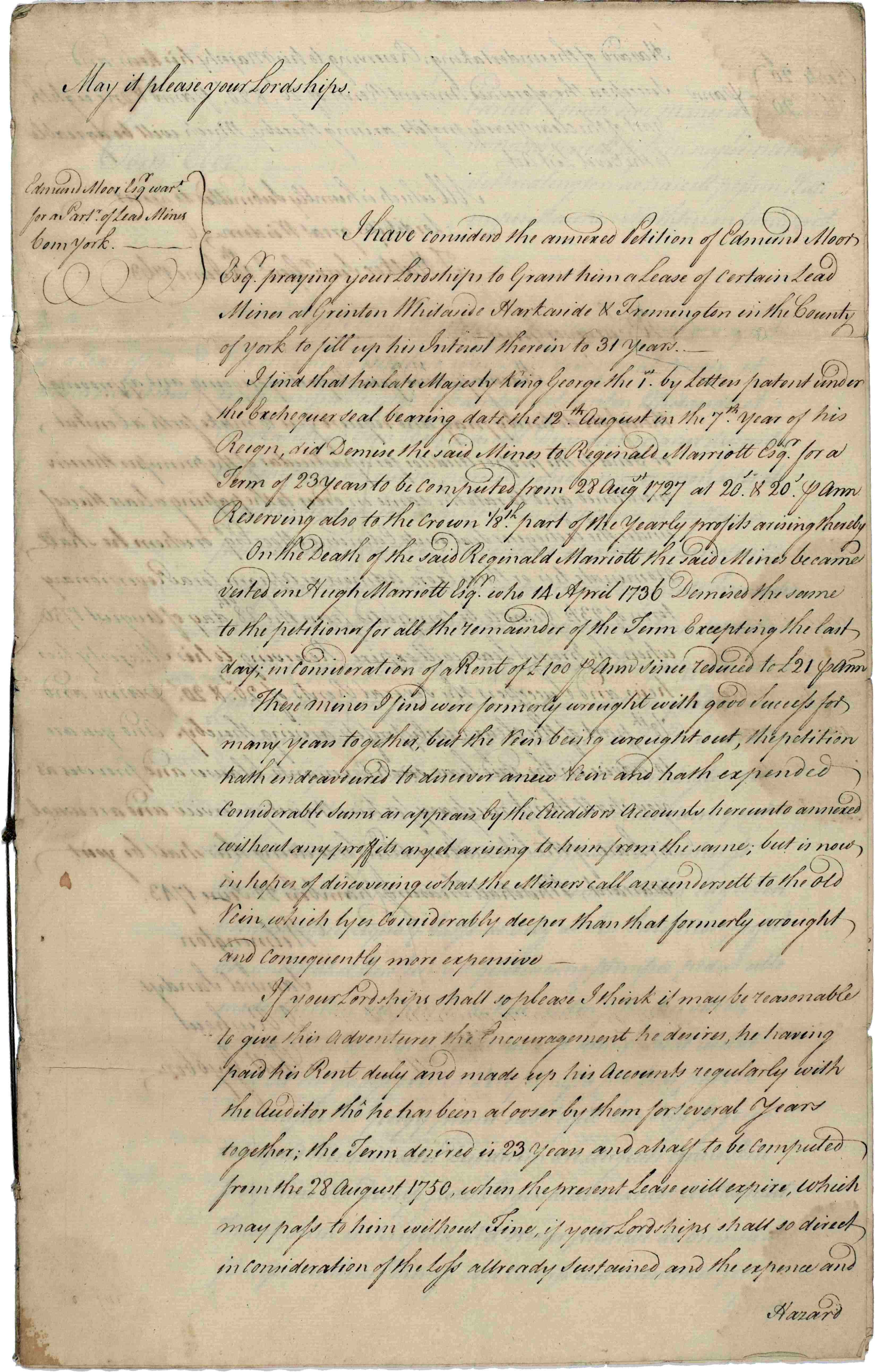 In this report of 1743, the Surveyor General advises on the lease following a petition from Edmund Moor for a lease of mines in Grinton, Whitaside, Harkerside and Fremington. The report is followed by a warrant for granting a lease to Edmund Moor.