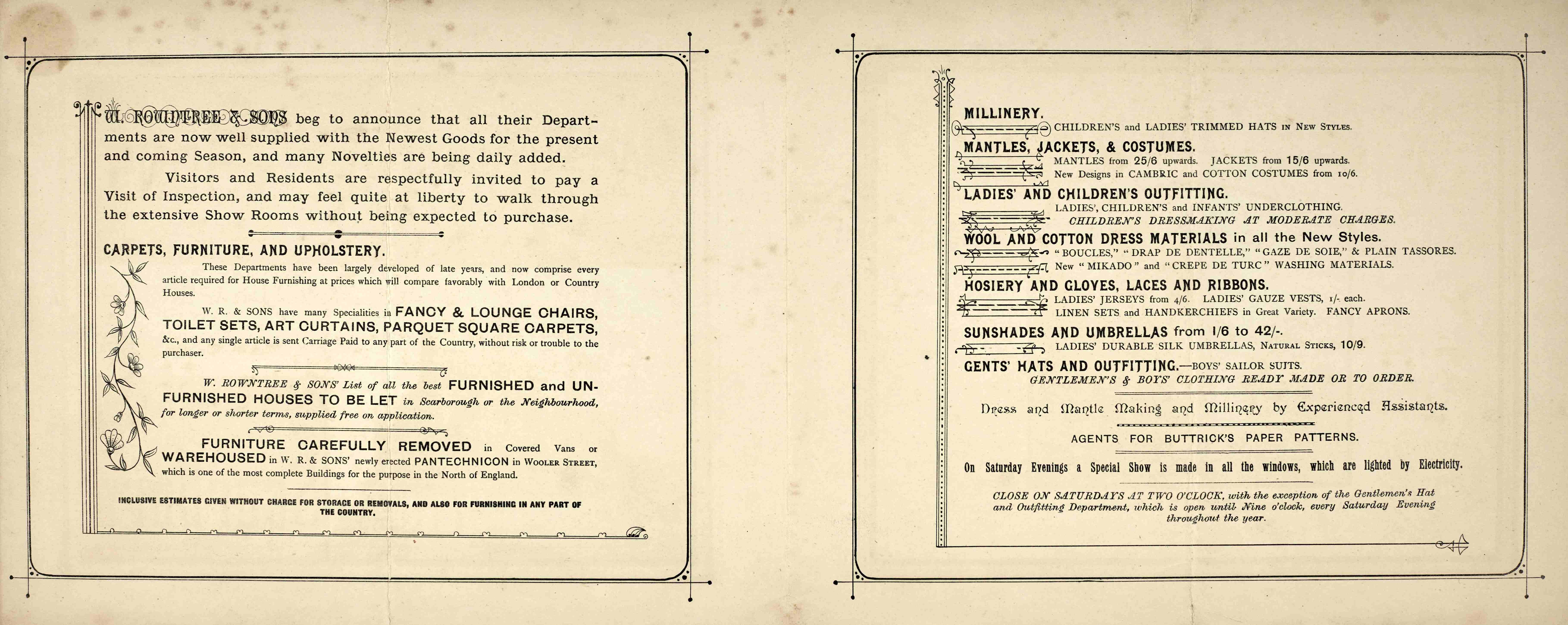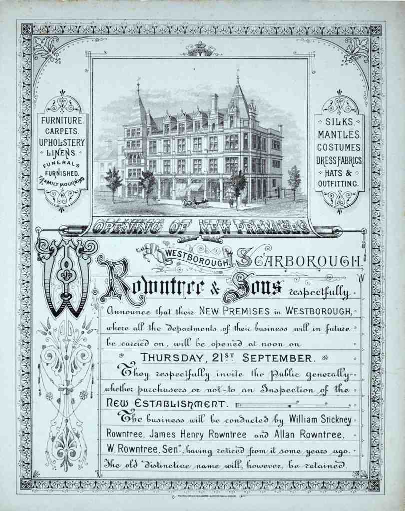 ’W. Rowntree & Sons beg to inform their friends that they have removed their business to more extensive and commodious premises situated at no’s 33 to 39 Westborough, Scarborough’.