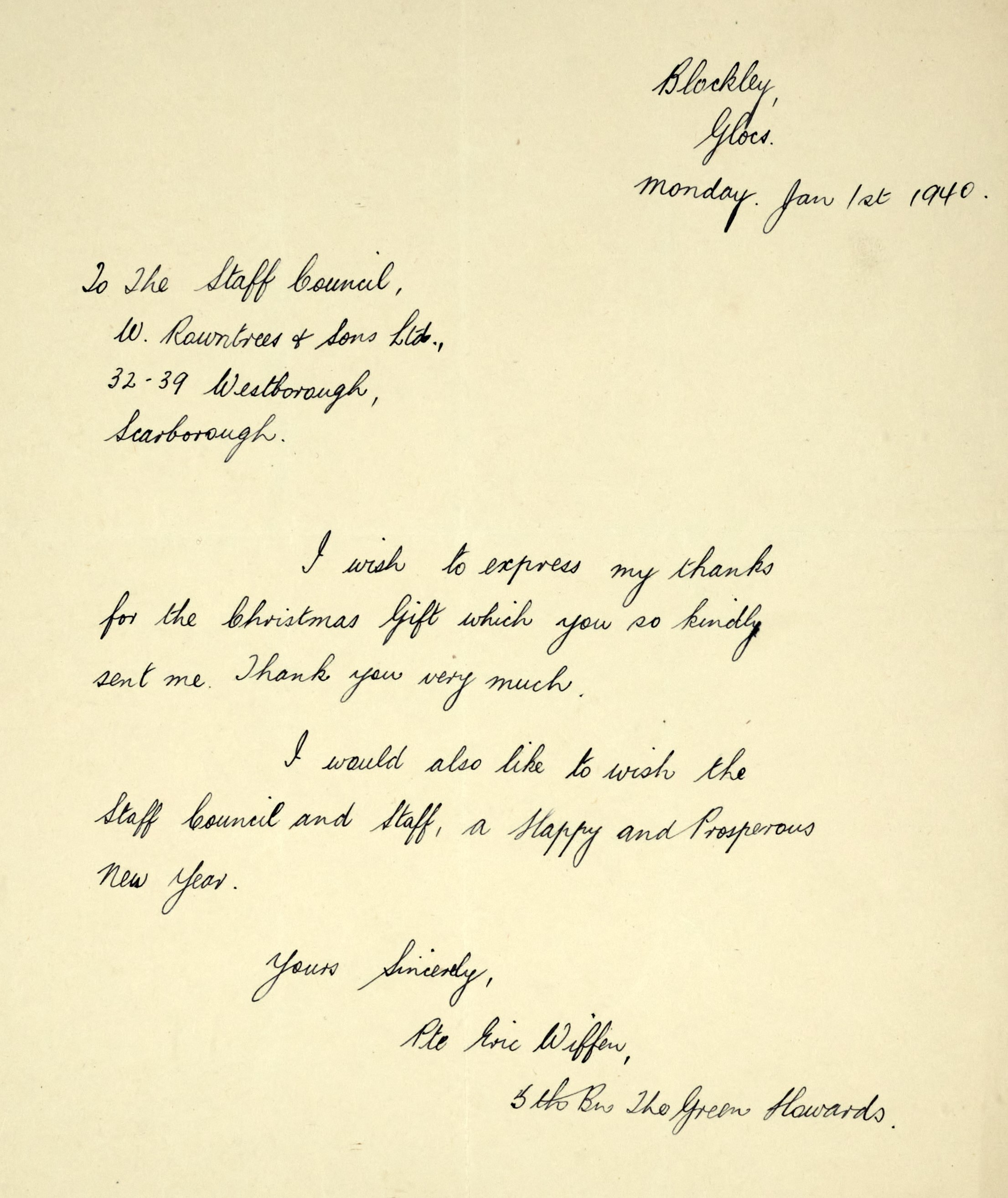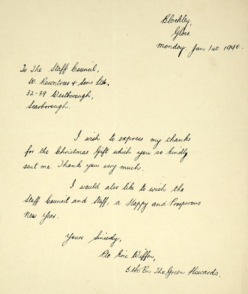 Letter of thanks to the staff council from Private Eric Wiffen serving with the Green Howards, 1 January 1940 [ZSJ 4/11] – Eric would not survive the war; he died at Tobruk in 1942 aged 21 years and is buried in Libya