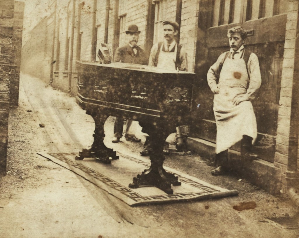 The services offered by W. Rowntree & Sons in furnishing funerals appears to have extended to pets. This curious photograph has a note on the back describing that the image shows a ‘coffin made for an old lady with a miniature coffin for her pet (probably a parrot) which she requested to be buried with her.’ The man on the right is identified as Billy Gatus, a cabinet maker employed by Rowntree’s.