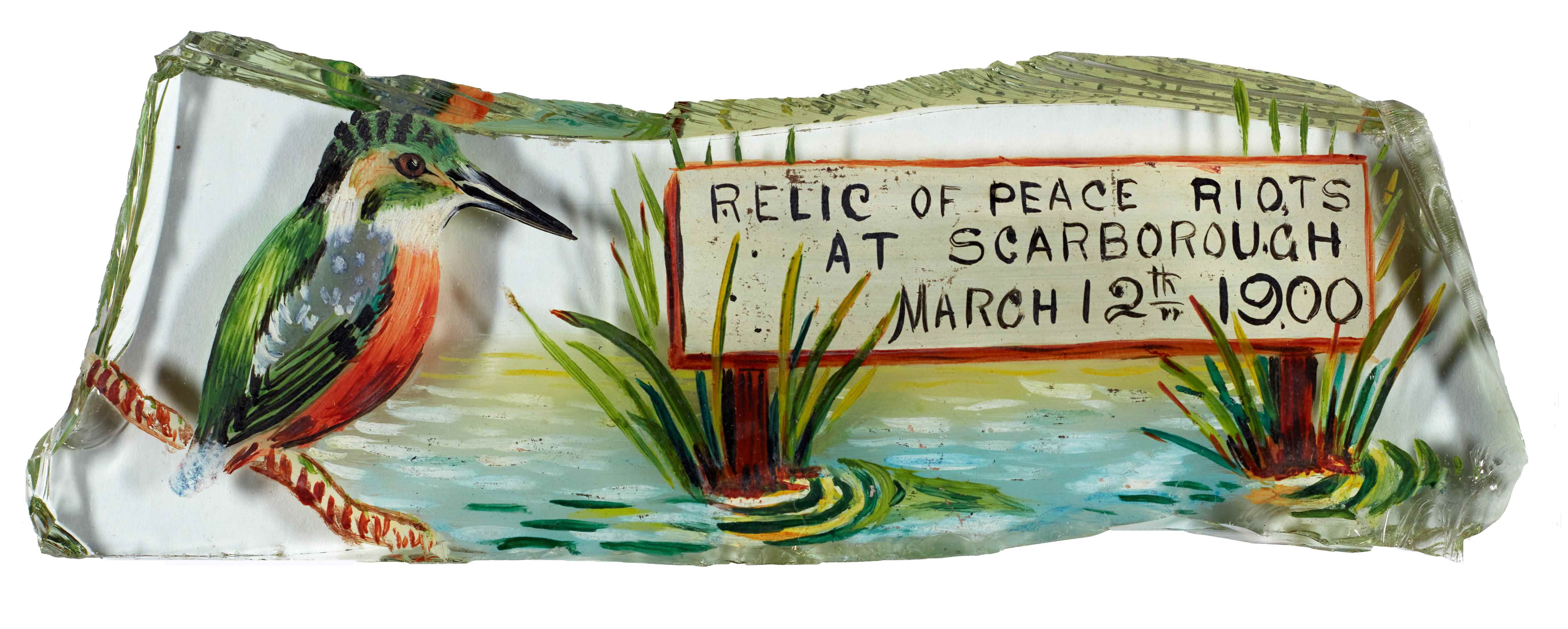 The Rowntree collection is unusual in that it includes some objects. A glass fragment from a window broken on 12 March 1900 has been preserved and decorated. It tells the story of a tumultuous time in Scarborough and unruly events centred around the Rowntrees and their businesses.