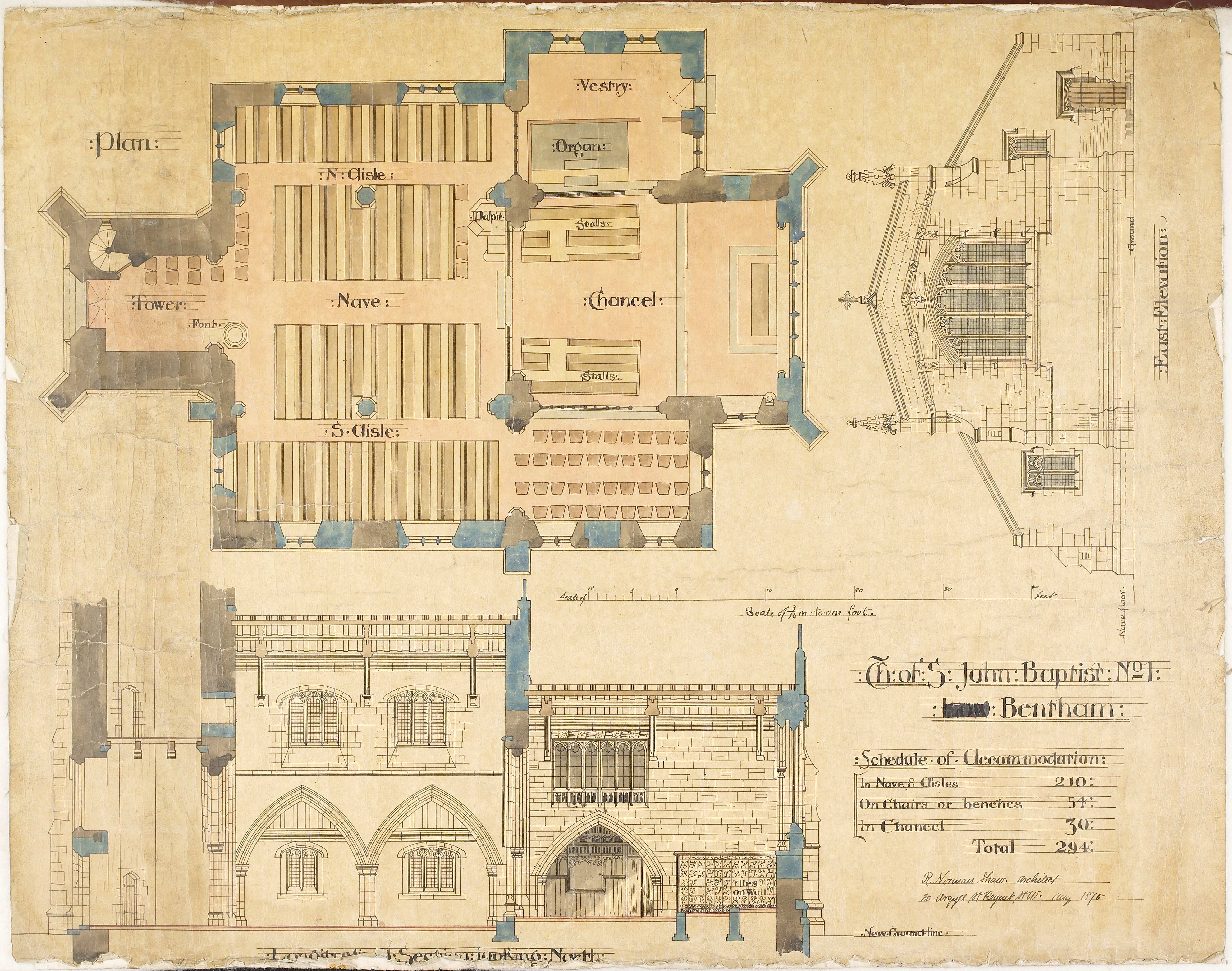 Low Bentham, St John the Baptist: Plan of the present seating (No.1), undated [PR-BNL 14-3] and Plan of the seating in the church, the east elevation, and a longitudinal section looking north (No. 1) by R. Norman Shaw, 30 Argyll Street, Regent St W, August 1875 [PR/BNL 14/2]
