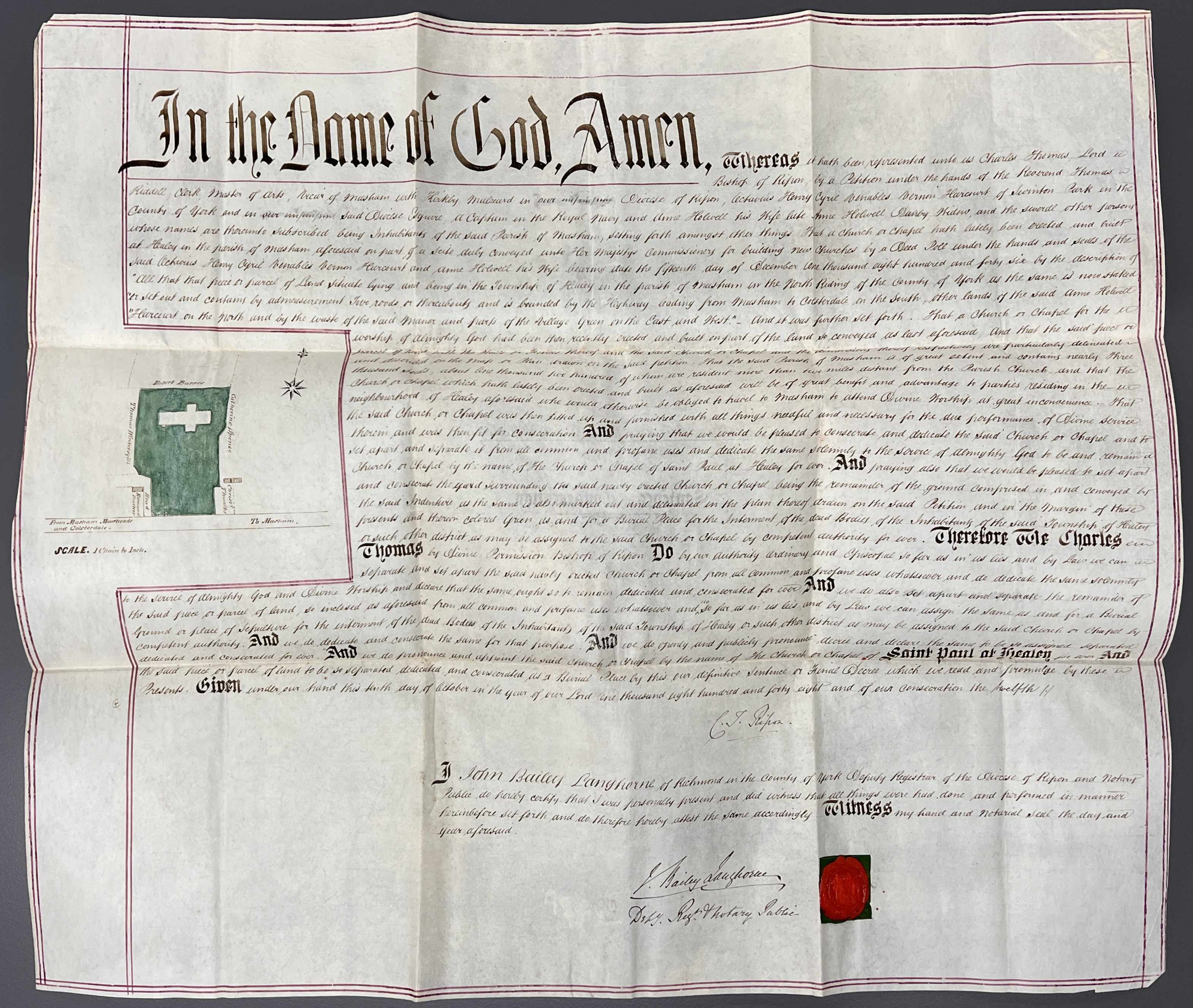 Ground plan of Healey church, signed by Lamb [PR/HEA 20/1] and sentence of consecration for the church, 10 October 1848 [PR/HEA 5/1]