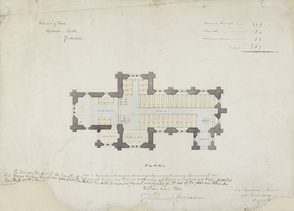 The relatively short-lived partnership of Coe and Goodwin was established in 1849 by Edwin Morton Goodwin and Henry Edward Coe, the latter of whom had been a pupil of George Gilbert Scott. Designs for Ugthorpe chapel, dated 20 December 1850 are signed Coe & Goodwin architects, 3 Great James Street, Bedford Row, London. The church was built 1855-1857. A calculation written on the sitting plan shows that there were 282 seats in total. Written beneath, the Vicar, William Long, has written: