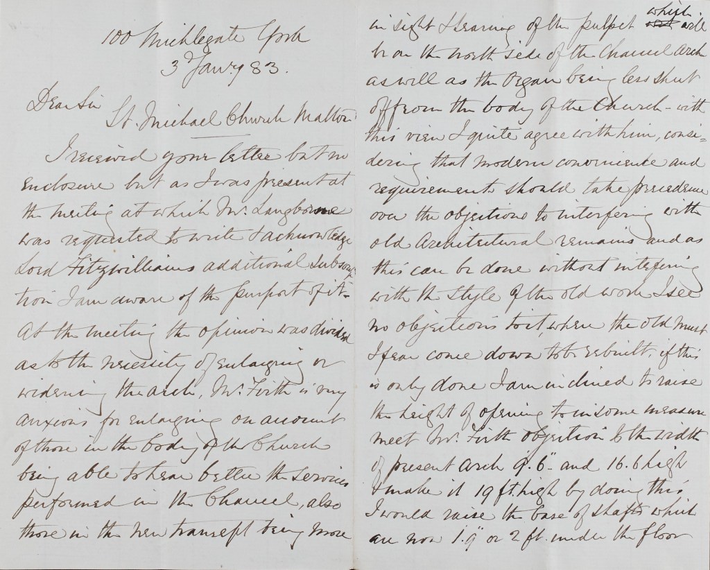 Letter from George Fowler Jones to the Hon. Admiral Douglas, agent to Earl Fitzwilliam, regarding plans (see above) for proposed works to the chancel arch at Malton, St Michael, 3rd January 1883
