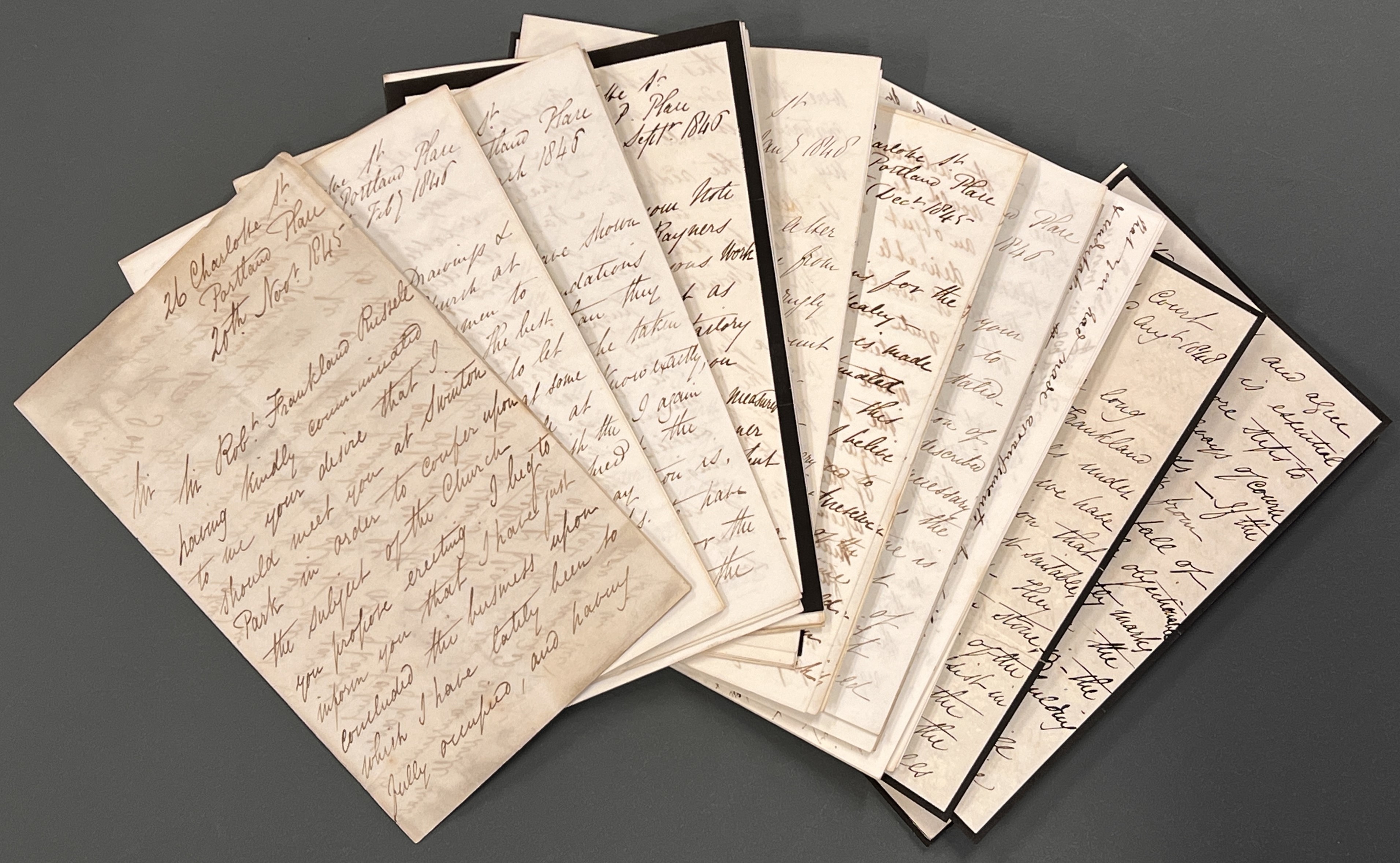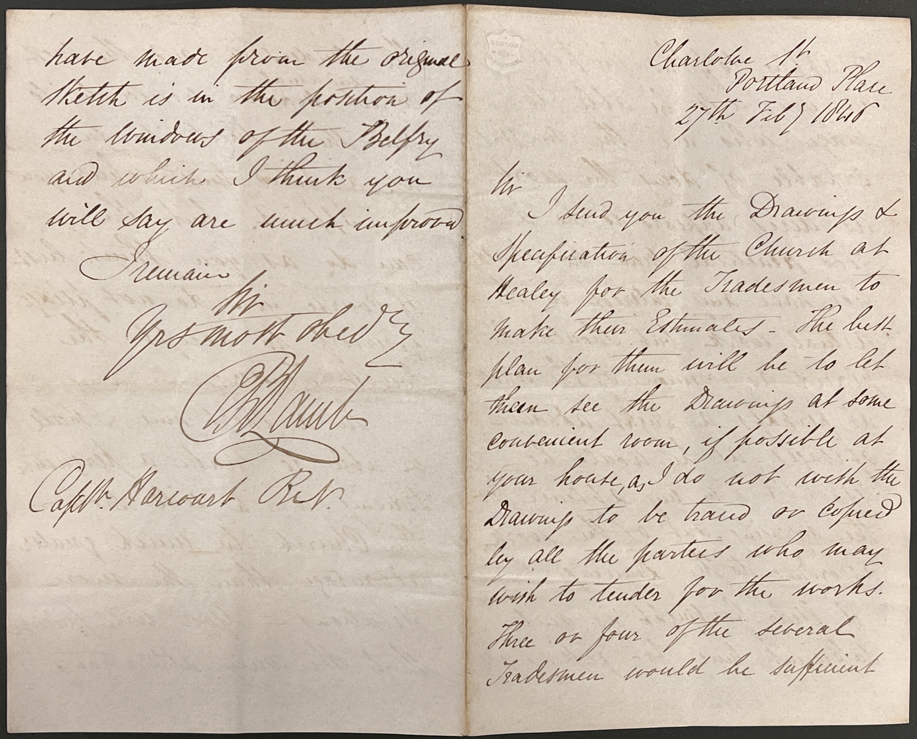 Selection of correspondence from E.B. Lamb to Captain Harcourt of Swinton Park about Lamb’s designs for Healey Church, near Masham, showing both pages of a letter dated 27 February 1846 [ZS Box 20]