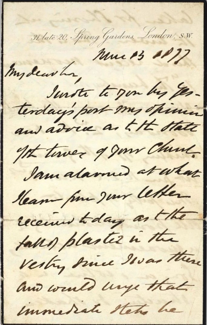 From the correspondence of George Gilbert Scott Jnr to the Reverend E.A.B Pitman of Stonegrave, we learn of the dangerous condition of the church tower at Old Malton, St Mary [ZUN 7/4]. On 11 June 1877, he writes: “My Dear Sir, Having very carefully examined the beautiful tower of your church, I regret to have to report that it seems to me to be in a very serious danger (the last four words underlined).” In a subsequent letter of 13 June, 2 days later (pictured), he writes “My Dear Sir, I wrote to you by yesterday’s post, my opinion and advice as to the state of the tower of your church. I am alarmed at what I hear from your letter received today as to the fall of plaster in the vestry since I was there and would urge that immediate steps be taken for shoring up the tower”.