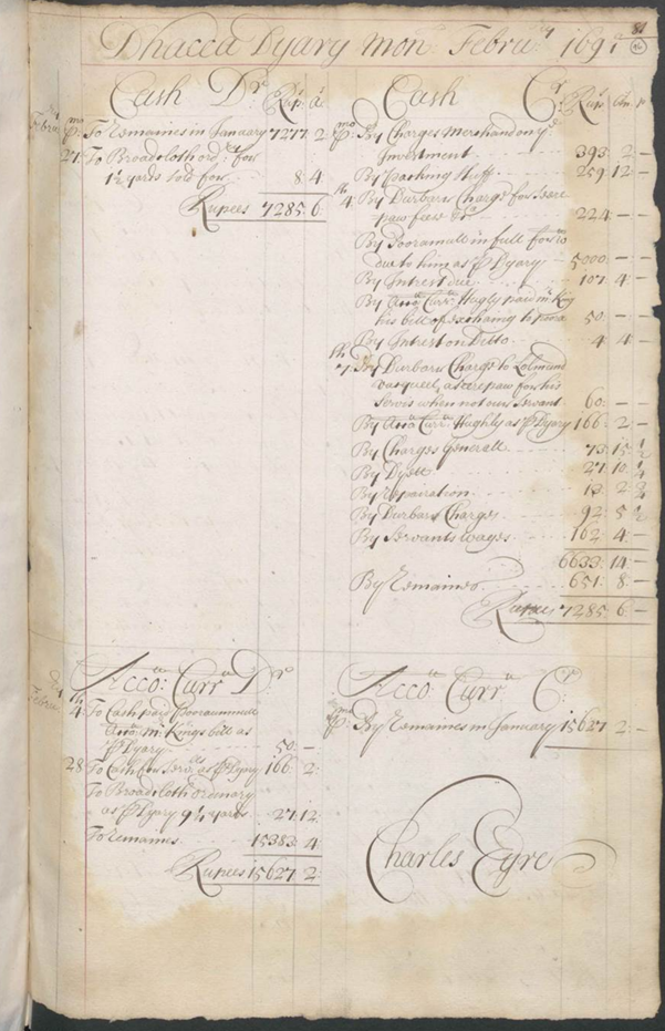 A page from the Dacca Diary, dated February 1690/1, which details expenditure clearly shows a charge to Lolmund, our mystery author of the letter, for his services ‘when not our servant’. It is signed by Charles Eyre, founder and president of Fort William, which may explain why the letter is amongst our records. He is the brother to Mary Eyre, wife of John Russell, whose sister married into the Frankland family.