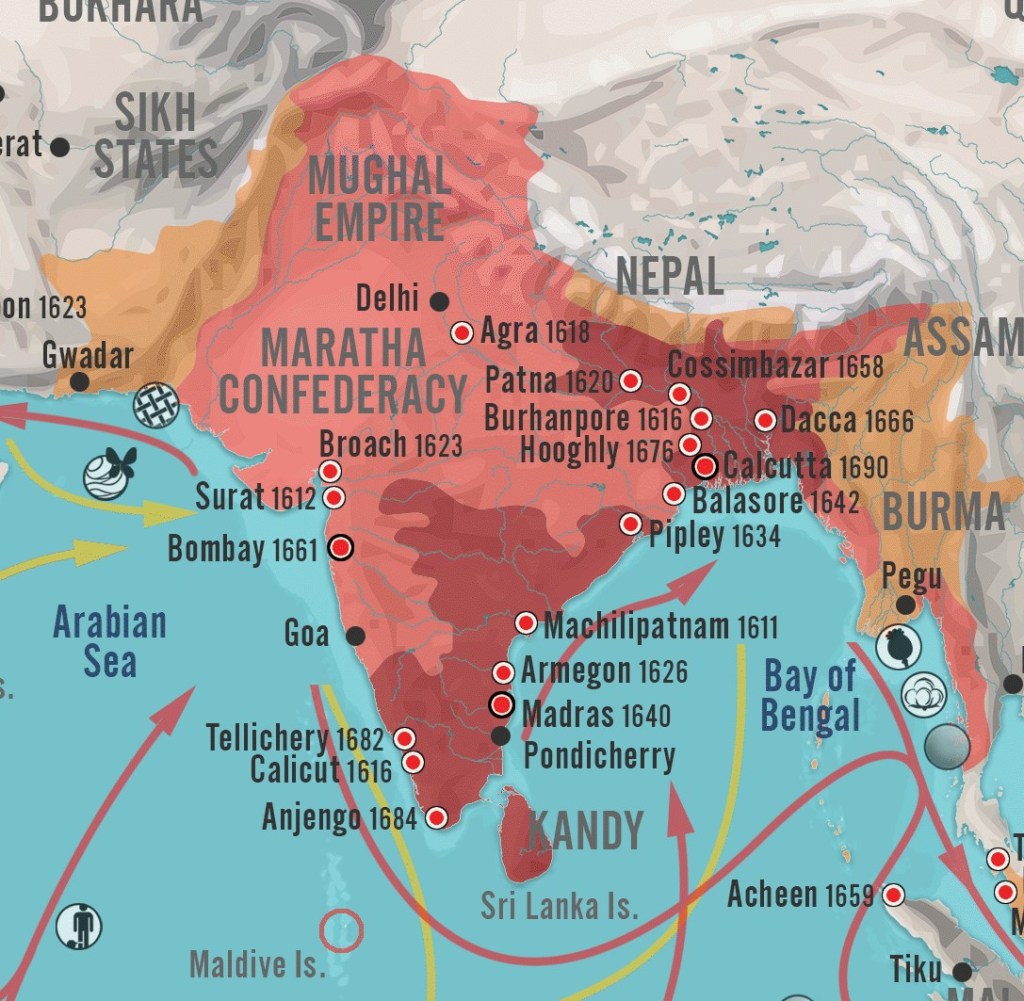 To buy Asian goods, several trading stations called factories were established along India’s coastline and manned with Englishman (See map below). One of these factories was the Dacca factory. In the mid-1600s, the EIC extended its activities to the Bay of Bengal and Dacca was one of the factories it established around 1666 and closed between 1696-1699.