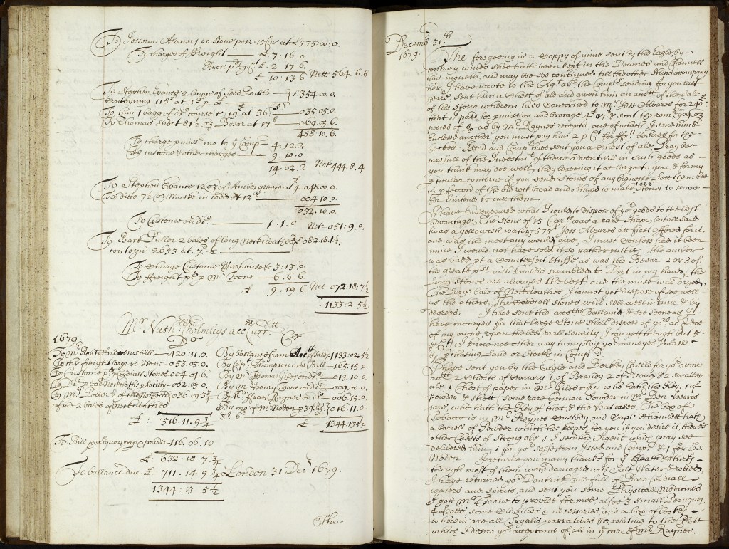 - R: Account of Nathaniel Cholmley’s commodities on ships, 8 February 1682 in Nathaniel’s letter book [ZCG V 2/2]
