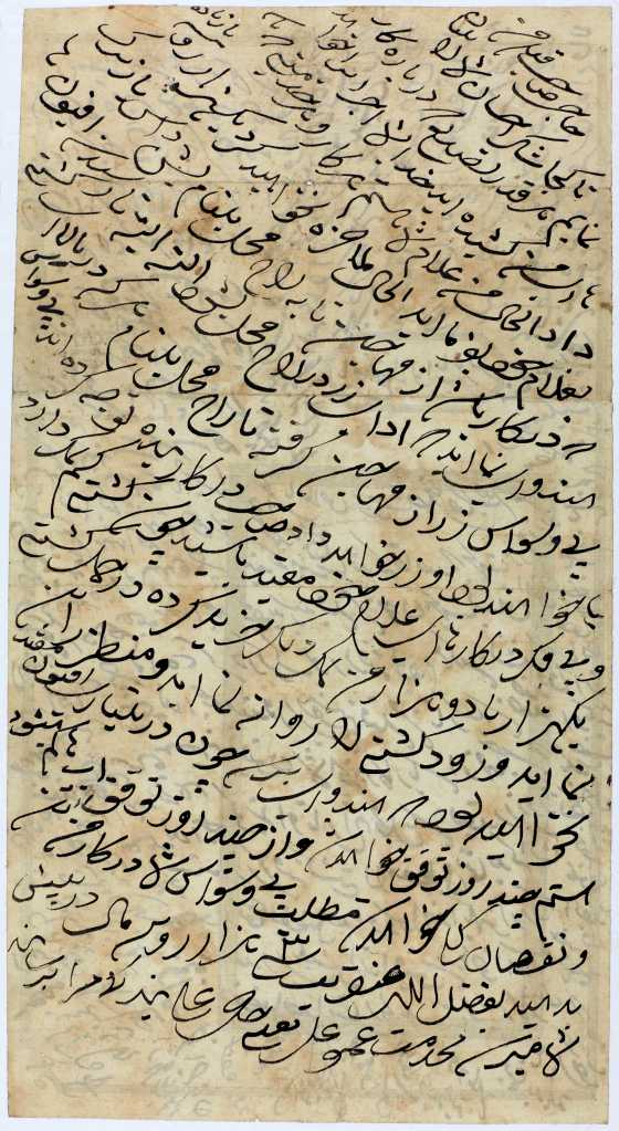 It is addressed to an unnamed Ḥājī Ṣāḥib by a man called Muhammad Rafīʿ. Muḥammad Rafīʿ acknowledges the arrival of Ḥājī Ṣāḥib’s messenger sent to collect a quantity of gold (amounting to a thousand rupees). The remainder of the letter addresses reasons for delays in making the payment. The writer and addressee are on intimate terms, knowing members of each other’s families and even concludes the letter by sending his regards to his uncles, ʿAlī Taqī and Ḥājī ʿAlī. Despite this, the letter is dominated by the subject of business transactions, arrangements for the transfer of cash to cover long and short-term debts, the preparation of commodities such as opium, cotton, and salt, and a ship’s cargo for imminent departure. As an example of the correspondence between two merchants, the maktūb records the context for these transactions as the provincial governorate of Bengal and Bihar, with operations in Gorakhpur, Rajmahal, and Hughli. The English are mentioned tangentially in the limited context of the transportation of goods.