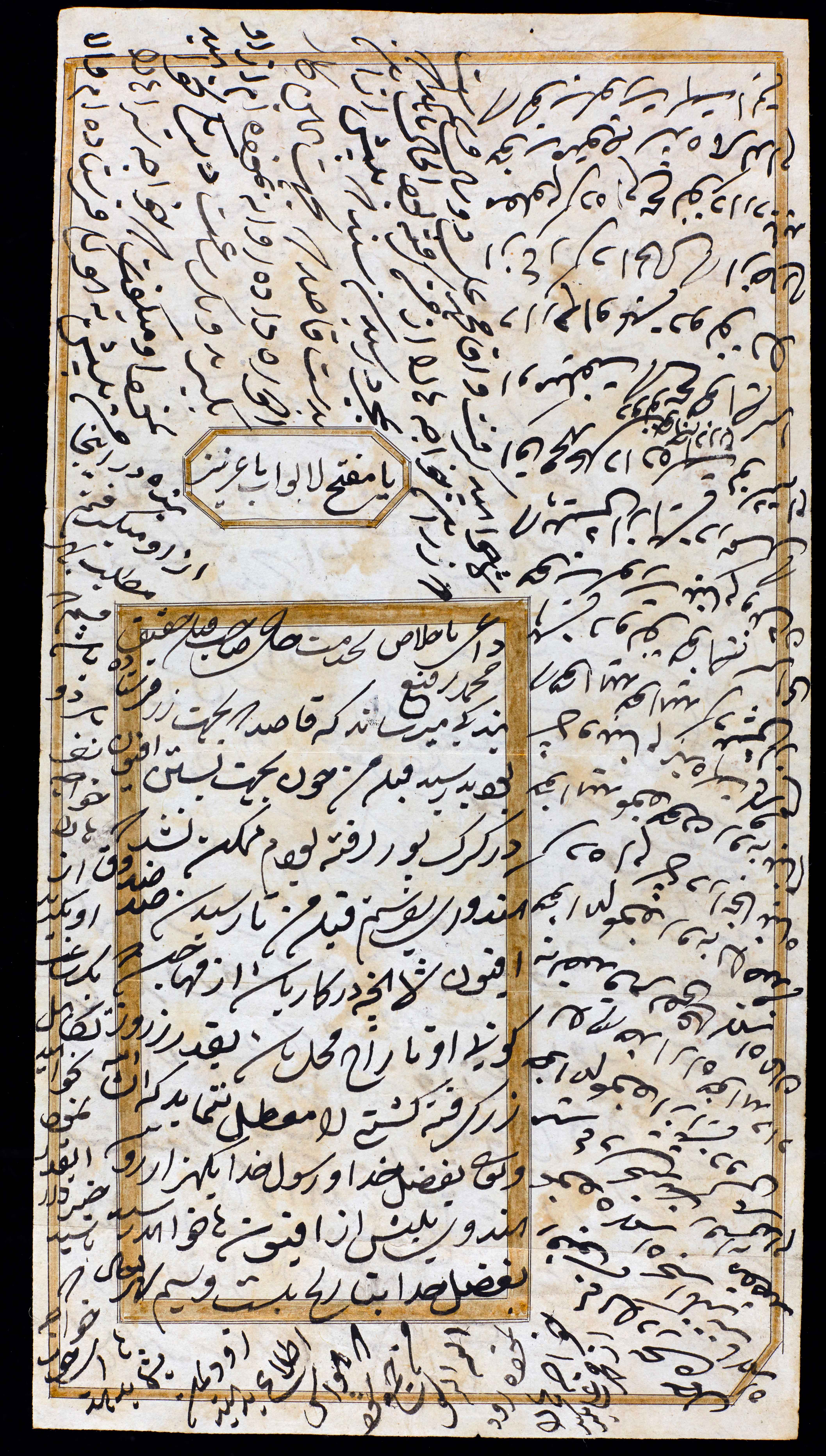 This is an undated letter written in Persian found in the ZPE collection. The unique design on the front side comprises of simple, black-outlined gold rulings defining a cartouche above the main text panel, and an outer border on a plain sheet of ‘Oriental’ burnished paper. Considering the contents of the letter, it can be concluded the document’s stationary appears to have been intended for use by rich elites.