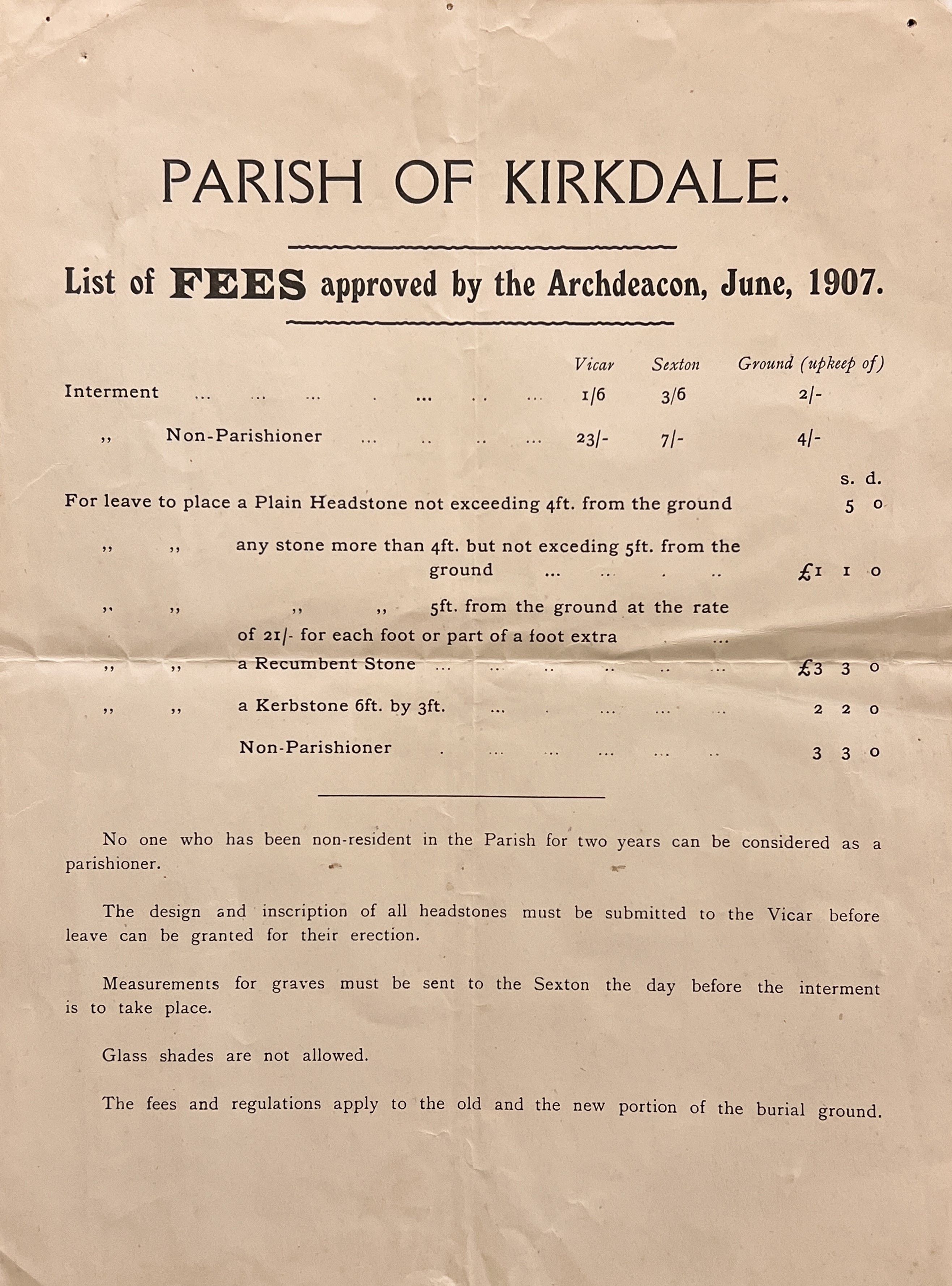 “As the value of money is greatly altered since the present fees were fixed, and the graves are now made much deeper, so that the fees are not now a proper remuneration for funerals. It is agreed by this meeting that the fee to the clerk for his attendance as clerk and for making the grave five feet deep be four shillings instead of two shillings as at-present and a shilling extra for one foot deeper.”