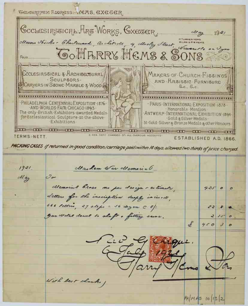 Faculty authorising the placing of a stone crucifix as a war memorial in the churchyard attached to Masham church, 6 September 1920, listing the names of those to be remembered [PR/MAS 10/5]