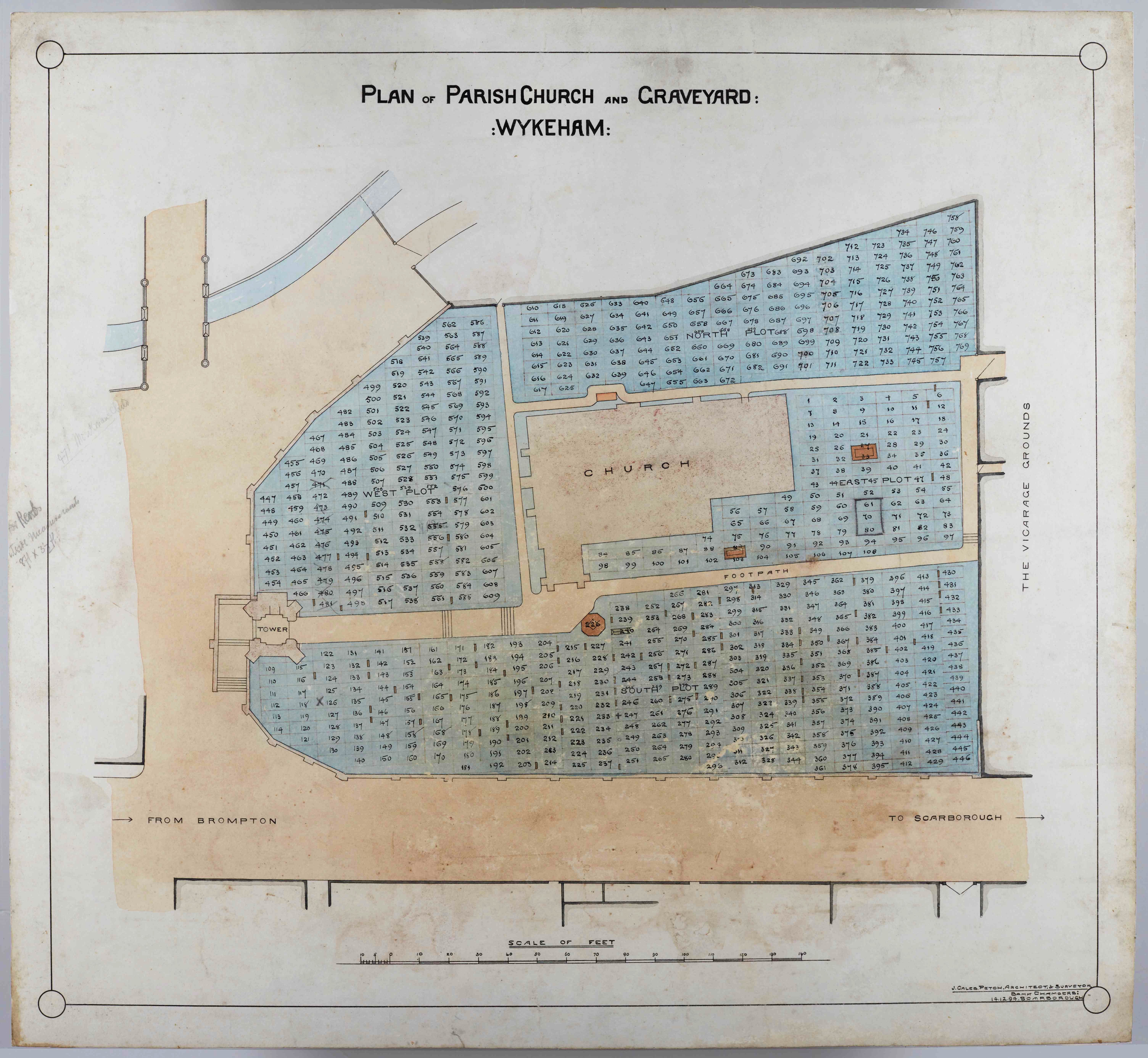 Plan of churchyard, Lastingham, St Mary surveyed and drawn by Richardson & Son, Lastingham, 1878 [PR/LAS 5/8] and Wykeham, St Helen’s & All Saints church and graveyard plan by J. Caleb Petch Architect & Surveyor, Scarborough, 14 December 894 [PR/WYK 10/1]