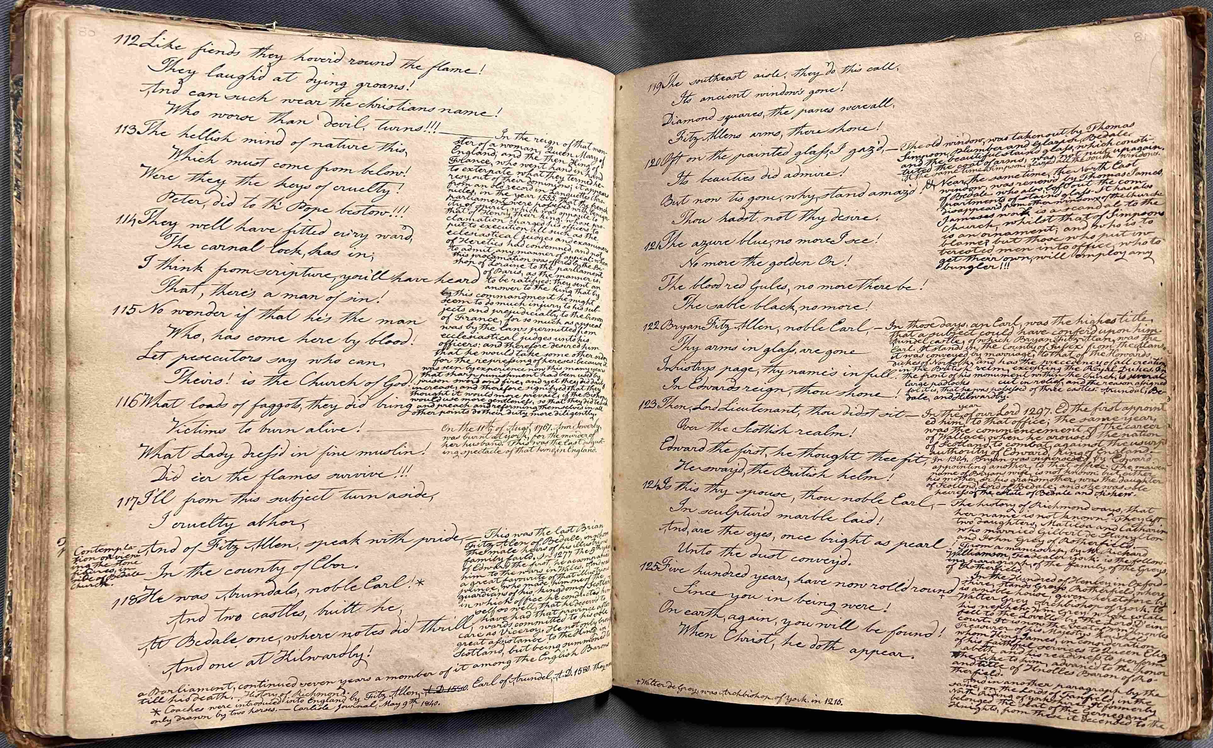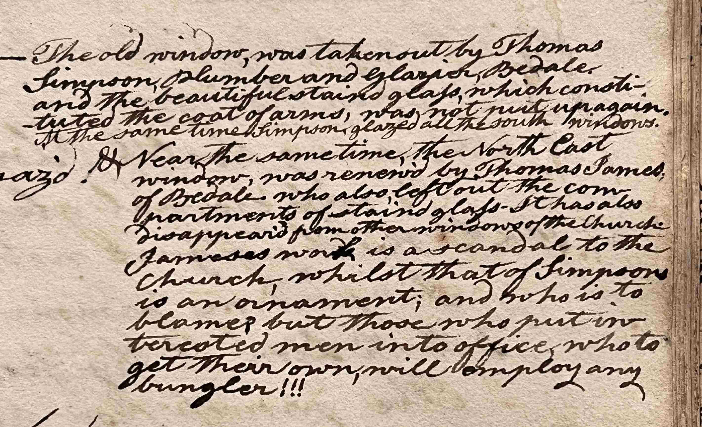 Pages from Hird’s Annals, with verse and adjacent notes recording the removal of stained glass in the church of Bedale, St Gregory by Thomas Simpson and Thomas James [ZBA 27/1/19 – I 81, 119a-122a and note 62]