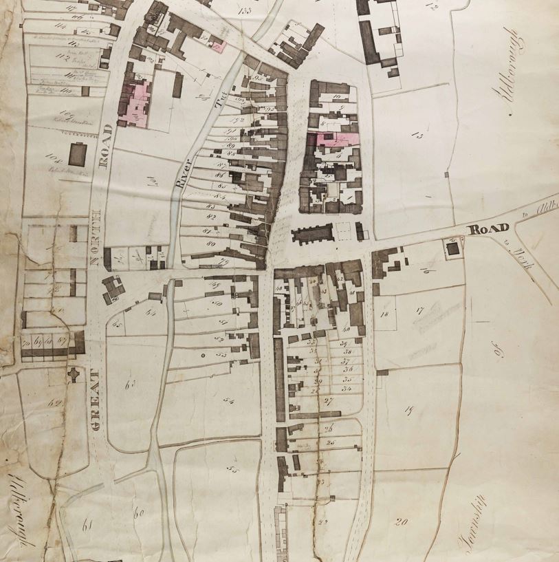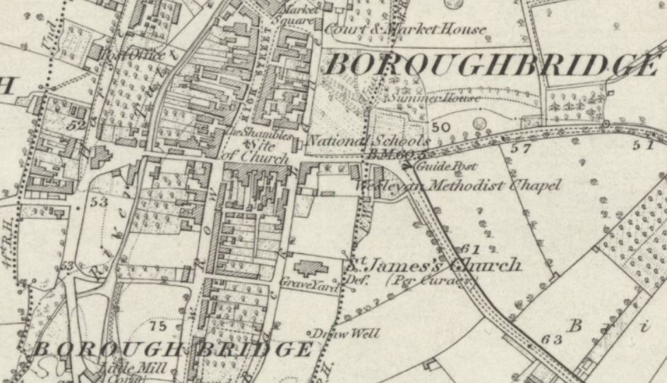 The 1846 Boroughbridge tithe map shows the medieval church of St James, in its original position in the heart of the town at the southern end of the High Street (now known as St. James Square). This church was demolished in 1851 and a new St James’ church, designed by Mallinson and Healey, built further to the south in Church Lane (previously Back Lane) the following year incorporating some items from the original structure. The 1st edition 6-inch to a mile Ordnance Survey map, surveyed in 1852 and published in 1855, shows the original location as ‘site of church’ and the newly-built church in its new position.