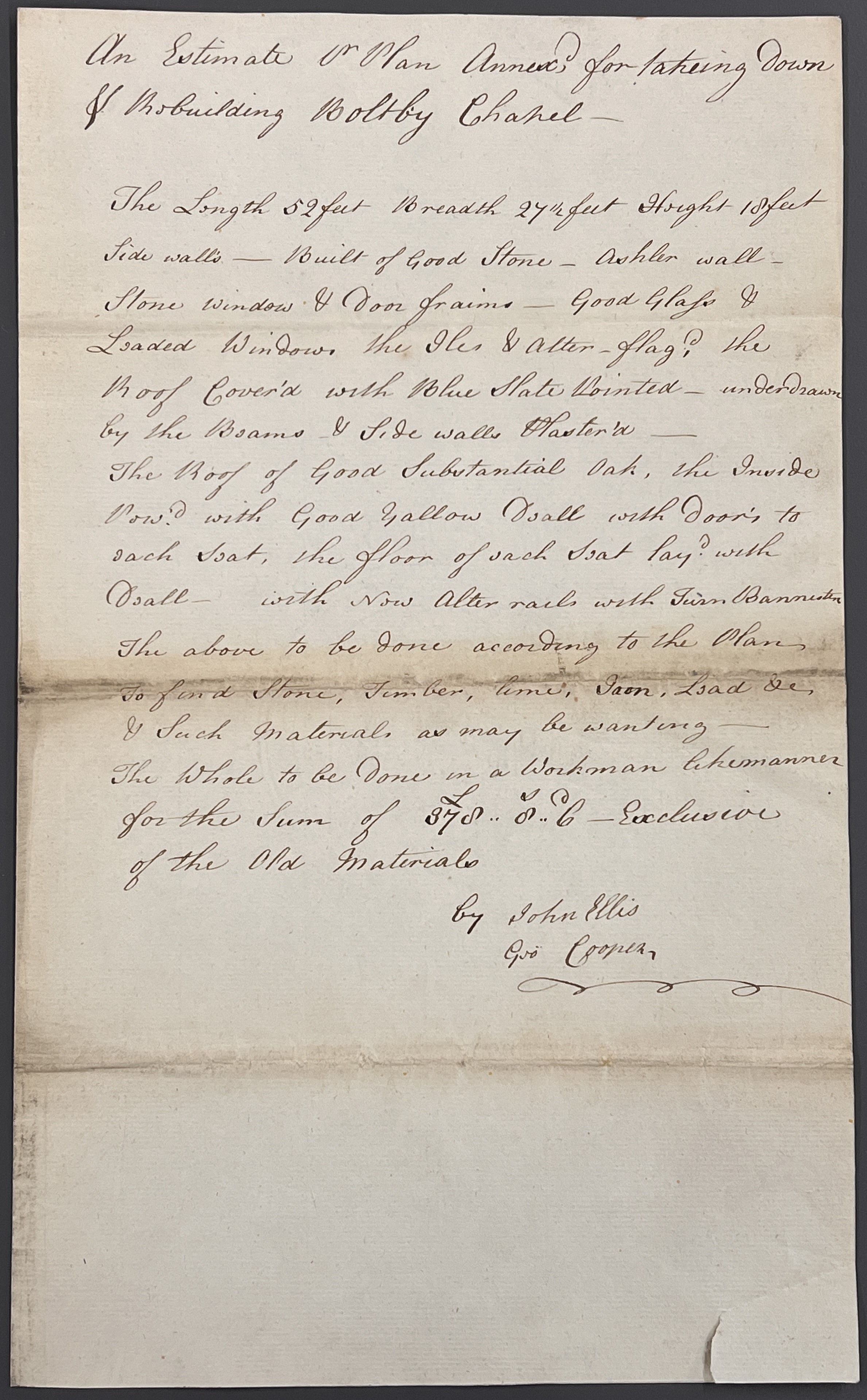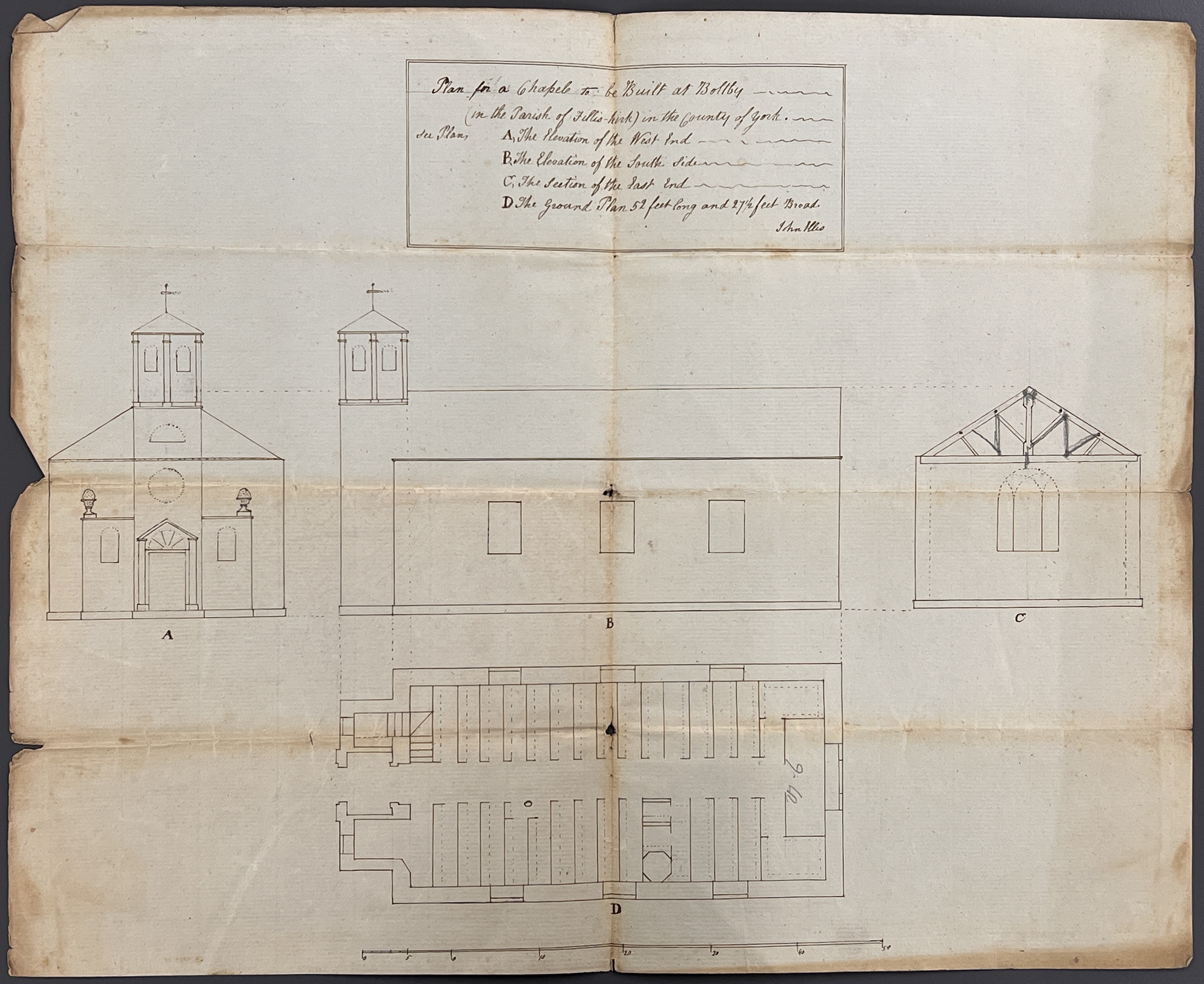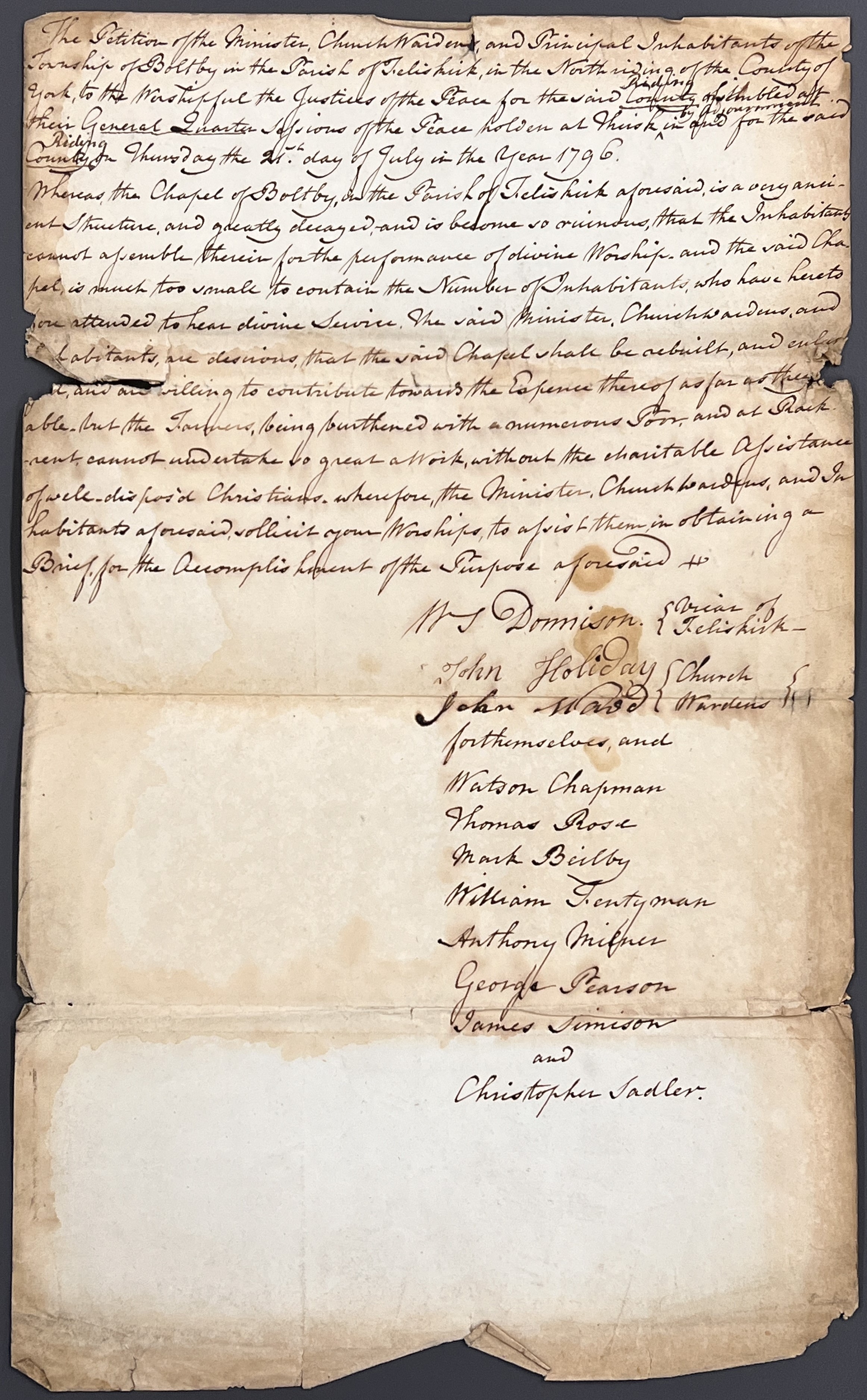 In July 1796, a petition of the minister, churchwardens and principal inhabitants of the township of Boltby in the parish of Felixkirk was made to the Justices of the Peace asking for a brief to raise money to rebuild the chapel, which was described as being ‘in great decay and is so ruinous that it cannot be used for worship‘. There is also a related plan of the proposed new chapel to be built at Boltby, and an estimate of the cost for the rebuilding and the demolition of the existing ruinous structure.