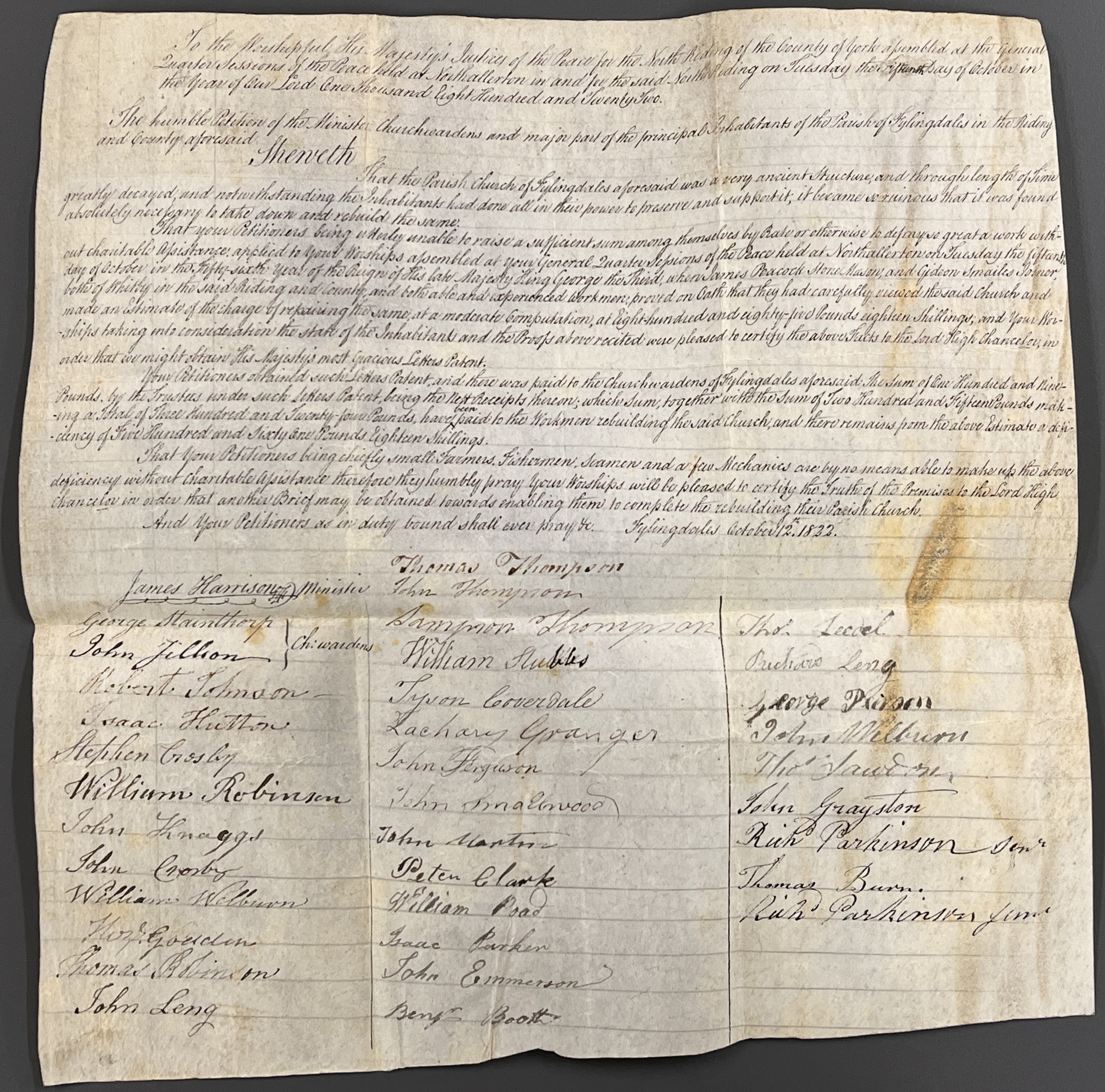A similar petition was made to the Justices in 1822 by the minister, churchwardens and 33 inhabitants of Fylingdales in the North York Moors. Their church had become decayed and, despite efforts to preserve it, it had to be demolished and rebuilt. On 15 October 1816, the petitioners had previously applied to the Justices who, after James Peacock stonemason and Gideon Smailes joiner, both able and experienced workmen of Whitby, estimated the cost of repair at £885 18s, certified this to the Lord Chancellor so that they could obtain letters patent. Following this, the churchwardens received £109 which, together with a further £215, has been paid to workmen rebuilding the church. They now ask the Justices to certify the facts again, so that another brief may be obtained.