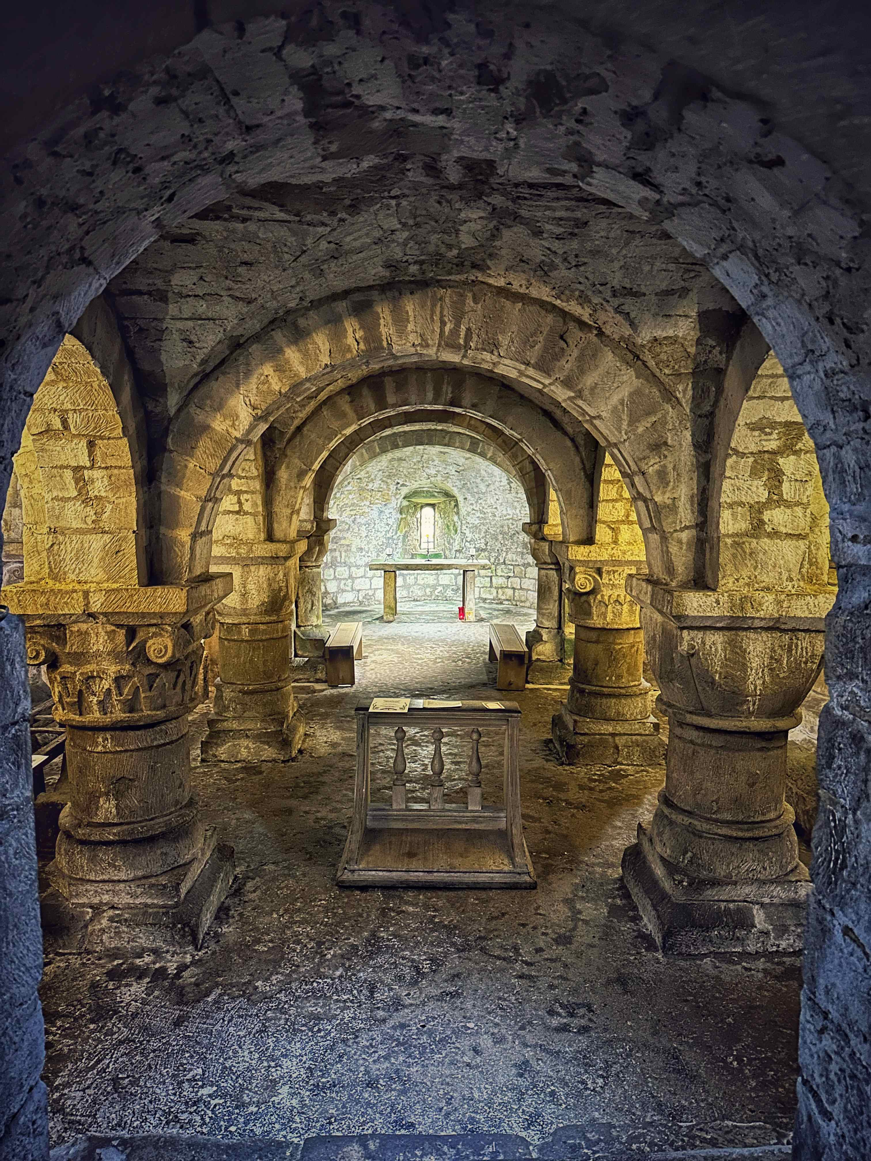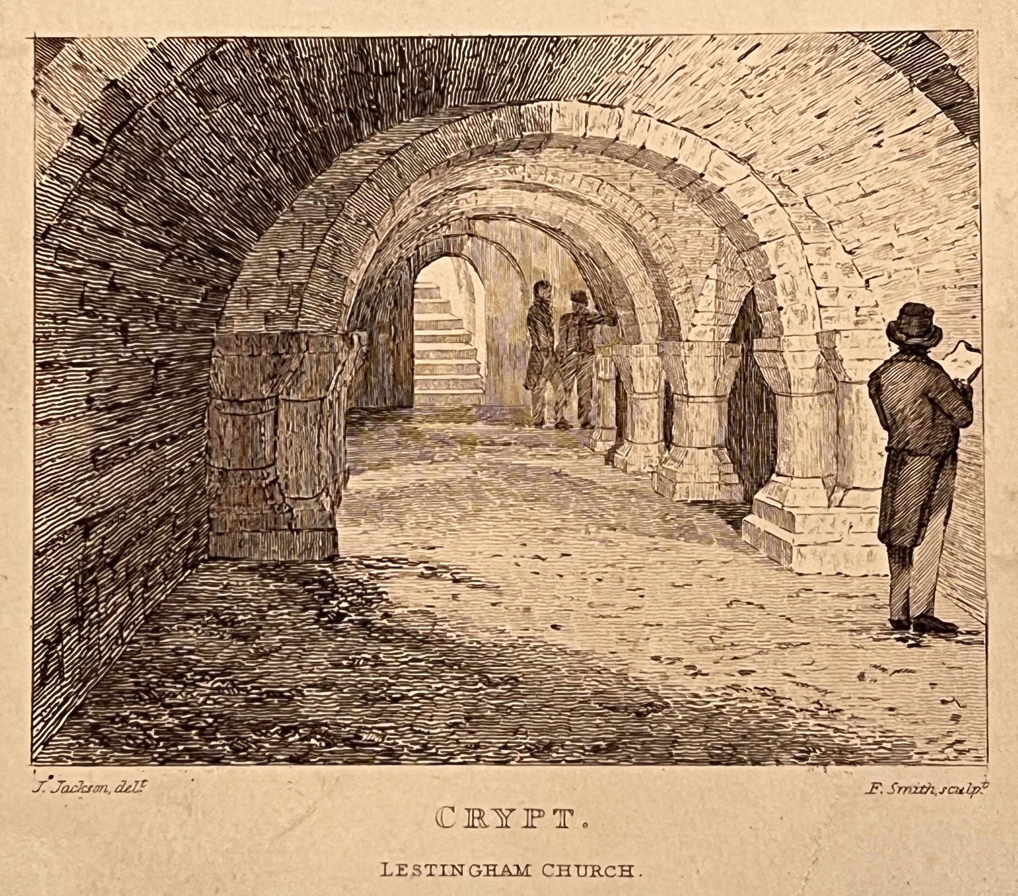 Photographs of the crypt at Lastingham, St Mary © Sophie Cawthorne, flanking engraving of the crypt after John Jackson R.A. [ZFO]