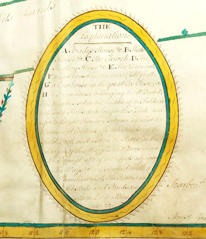 The village of Pickhill is shown in colourful detail on this estate map of 1765, including individual houses, the gates in the field boundaries, even down to the red flowers in the Rectory garden. A key to this map identifies the letters and numbers, including the names of the fields and their ‘occupation’, whether arable, pasture or meadow, and that the church at Pickhill is dedicated to All Saints, and in the patronage of Trinity College, Cambridge. The following College lands can be identified from the map:
