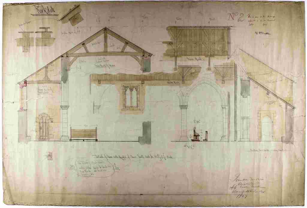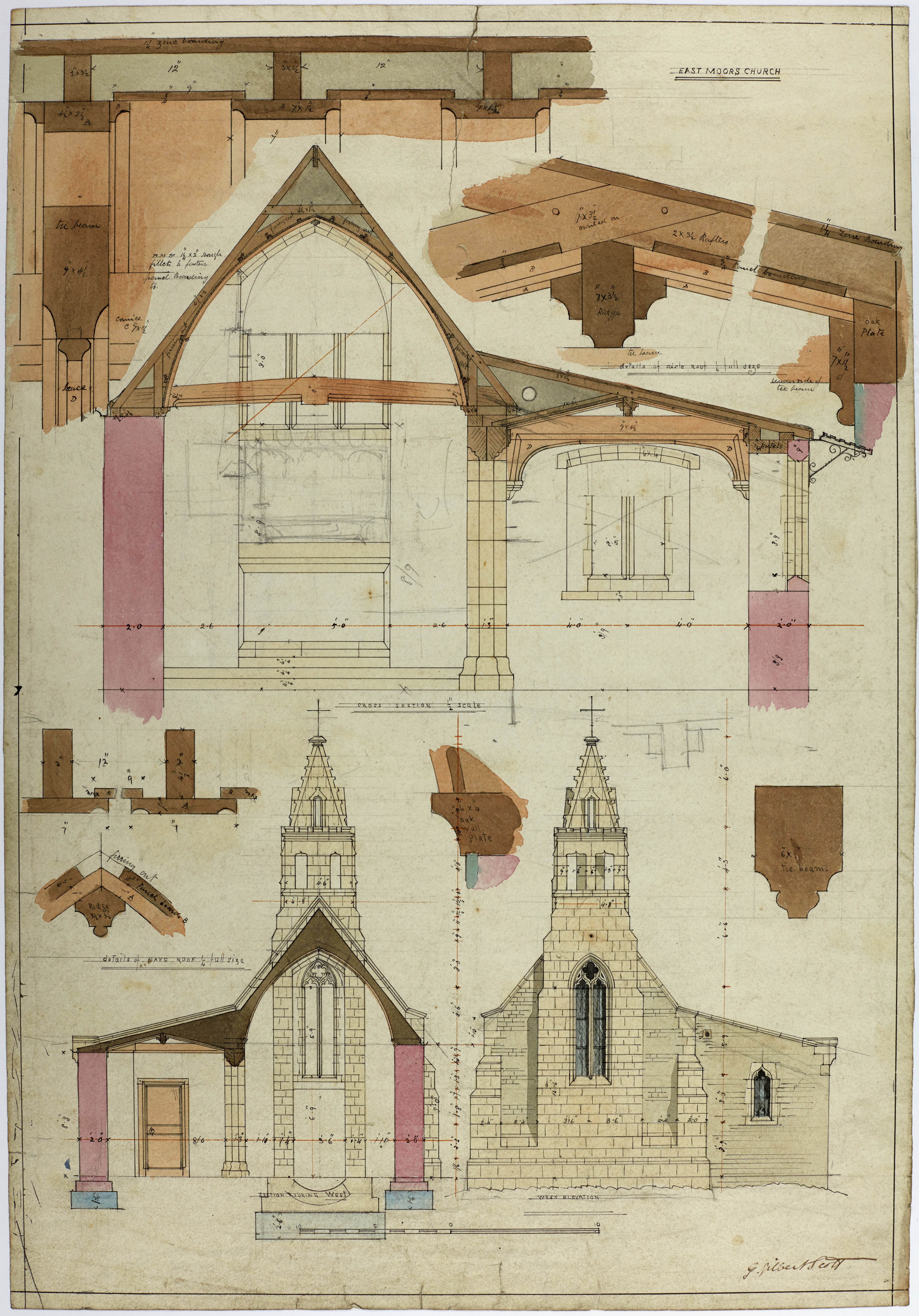 These colourful drawings, in the Gothic Revival style, were some of the last produced by architect George Gilbert Scott Jnr (1839-1897). The building work was completed by his former student Temple Moore (1856-1920) in 1882. It is said that Poet Laureate, John Betjeman was so inspired by East Moors, he wrote his 1976 poem ‘Perp. Revival i’ the North’ about it.