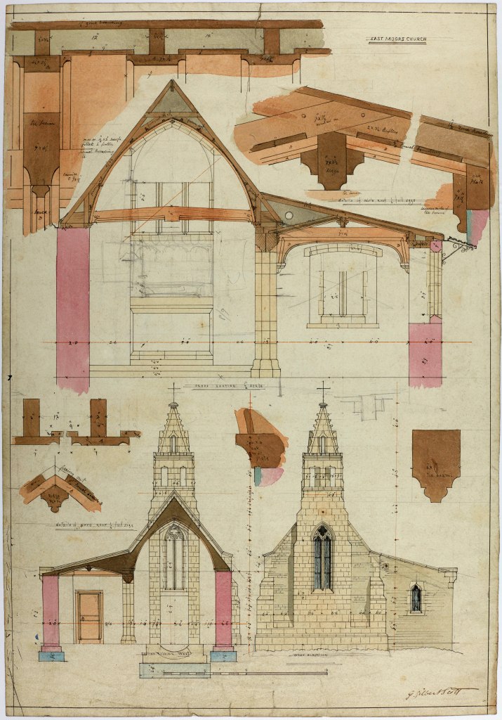 Designs for the Church of St Mary Magdalene, East Moors, near Helmsley signed by George Gilbert Scott Jnr (1839-1897), undated (c.1880s), L-R: section & elevations [PR/HEL 30/4/4]; plan & south elevation [PR/HEL 30/4/3];long section, east elevation & east window [PR/HEL 30/4/1]