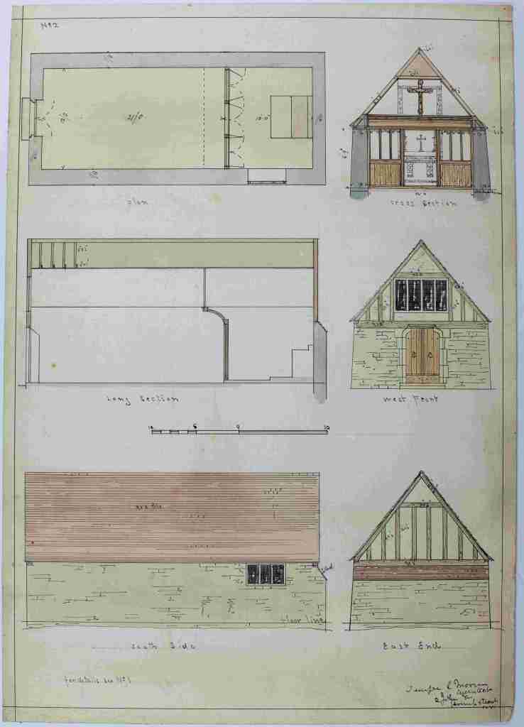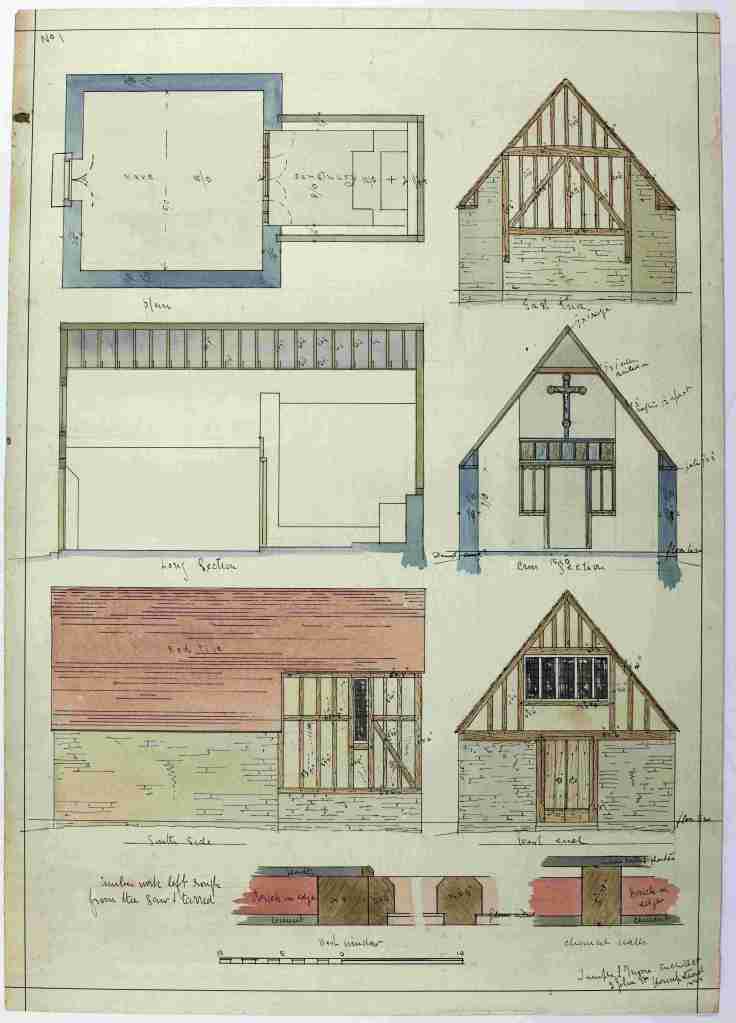 The Gilbert Scott designs above show the church with a nave and an aisle to the south, and a stepped bell spirelet at the west end. As built, the aisle can be divided from the nave by wooden partitions and there is a painted wagon roof. The Temple Moore designs below, are for different ground plans and timber-framed elevations.