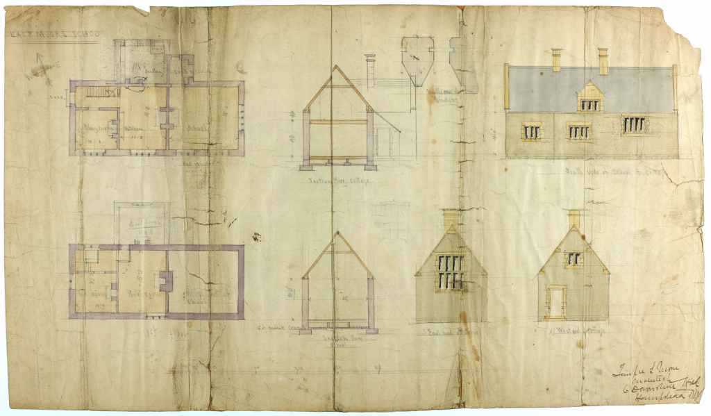 Plan, sections and elevations (nos. 1-3), signed by Temple L Moore, 2 John St., Hampstead, London, NW, undated [PR/HEL 30/4/6-8]