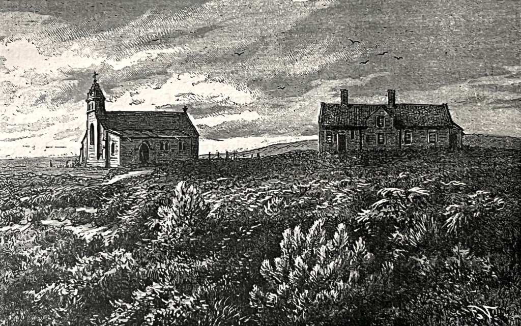 Quote and illustration of church and school from ‘Eighteen Years’ Work in a Yorkshire Parish, a neighbour’s account of it’ by Reverend Newton [PR/HEL 29/1/1]