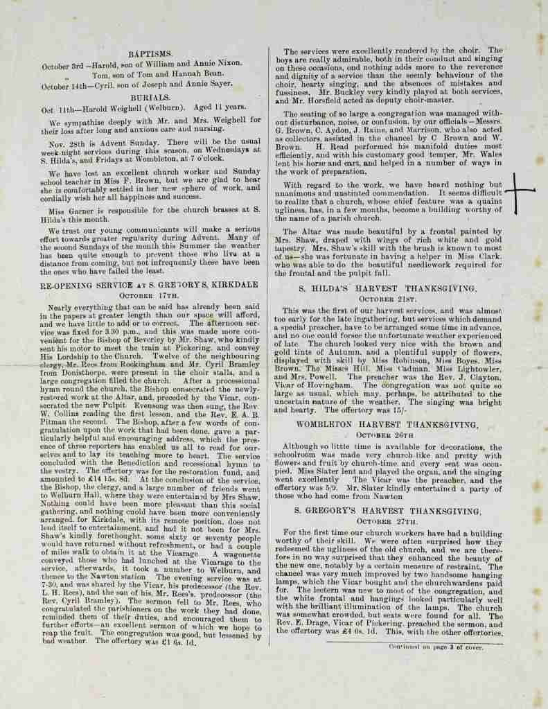 The November 1909 edition of the Kirkdale parish magazine records that the Bishop of Beverley consecrated the newly-restored work at the reopening service of the church on October 17th. The penultimate paragraph of the article states: “With regard to the work, we have heard nothing but unanimous and unstinted commendation. It seems difficult to realize that a church whose chief feature was a quaint ugliness, has, in a few months, become a building worthy of the name of a parish church.”