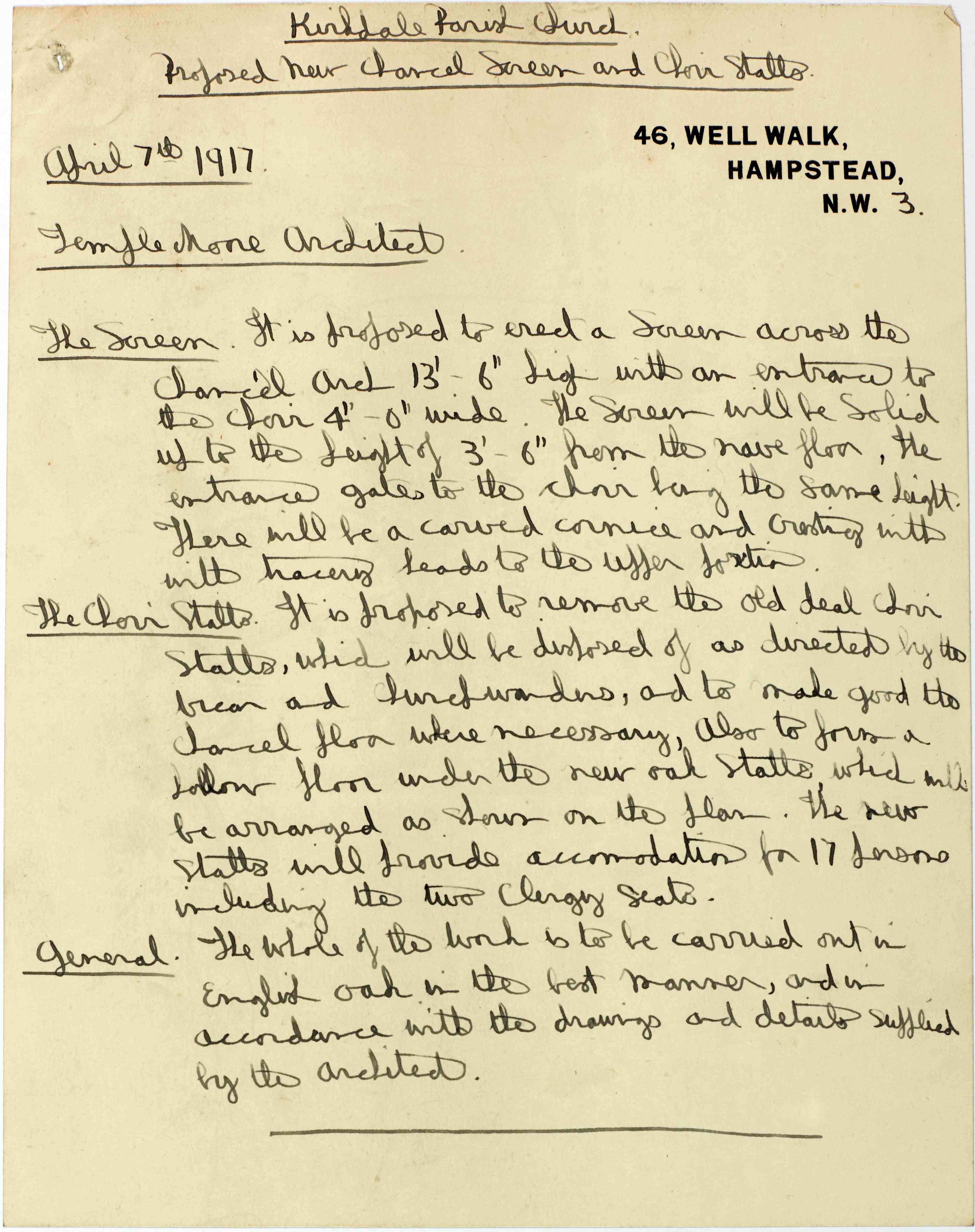 L-R: Written summary of proposals by Temple Moore for new chancel screen and choir stalls, 7 April 1917 with sketch for proposed chancel screen, elevation looking east by Temple Moore (No. II) annotated below: ‘suggested lettering for the chancel screen: SERVE THE LORD WITH GLADNESS’ [PR/KRD 7/4/12]; Faculty for a chancel screen and replacement of choir stalls and altar rails, 22 June 1920 [PR/KRD 7/1/1]