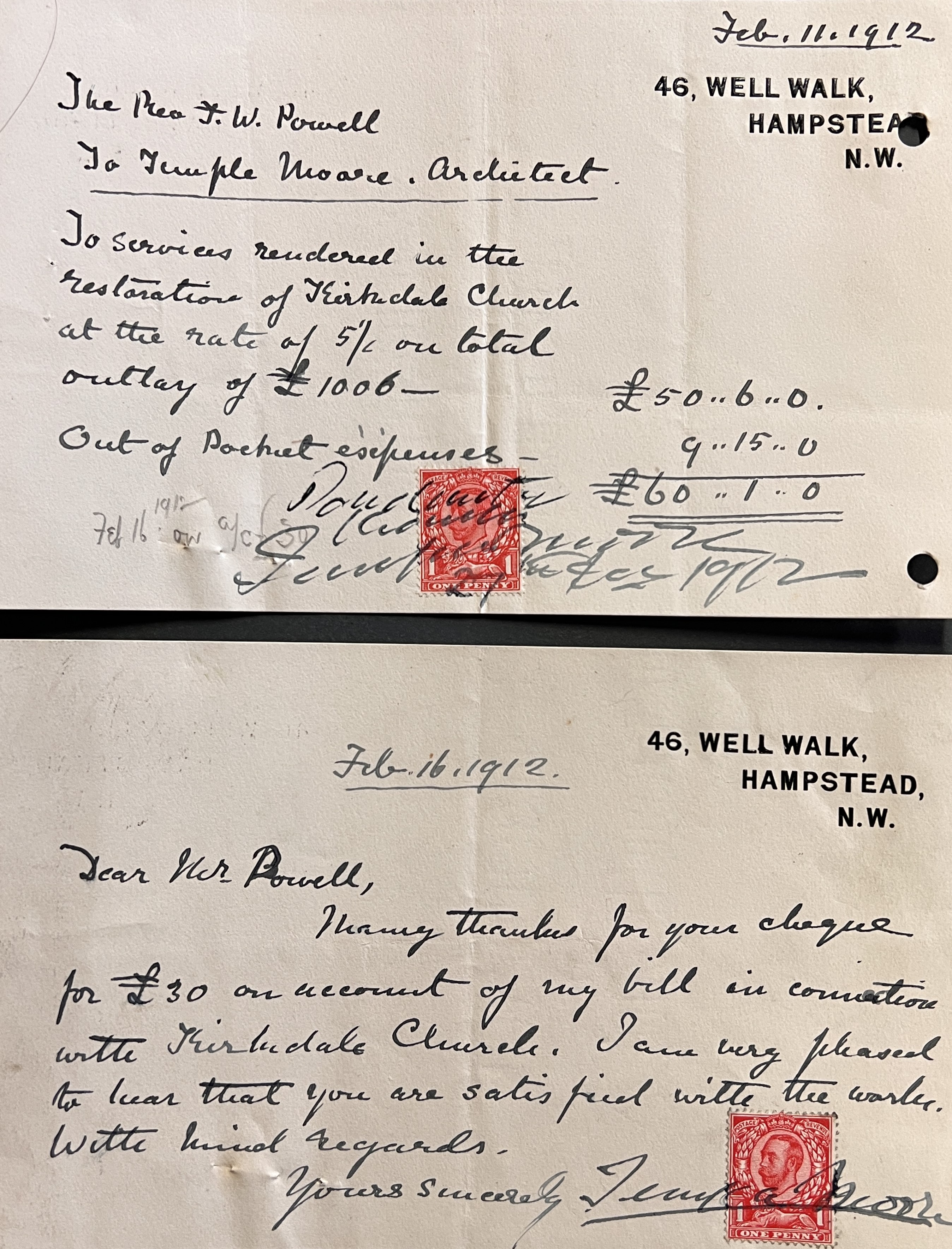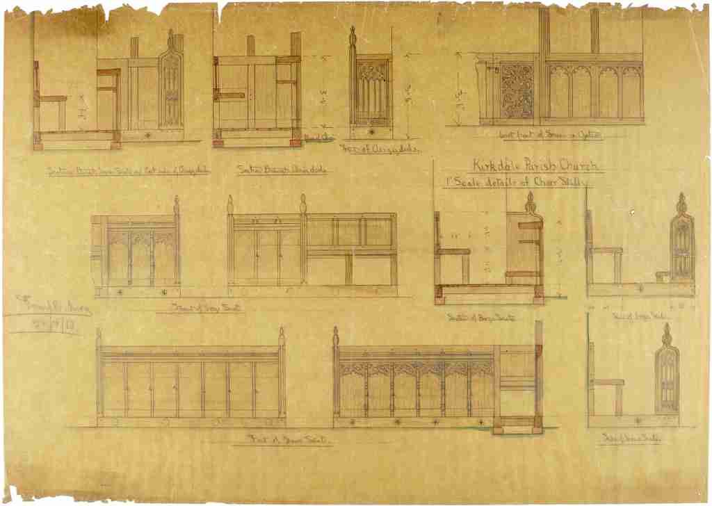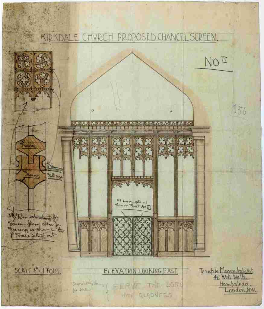The Kirkdale parish record archive also contains correspondence from Temple Moore to the Revd Powell dated 11 February 1912, acknowledging receipt of a payment for his work on Kirkdale church. Moore also writes on 16 February 1912: “I am very pleased to hear you are satisfied with the works.” By December 1916, the correspondence accompanying the submission of plans and revised plans for choir stalls appears to be written and signed by R Temple Moore, presumed to be Temple Moore’s son Richard, who assisted his father in his later work, until his untimely death in 1918.