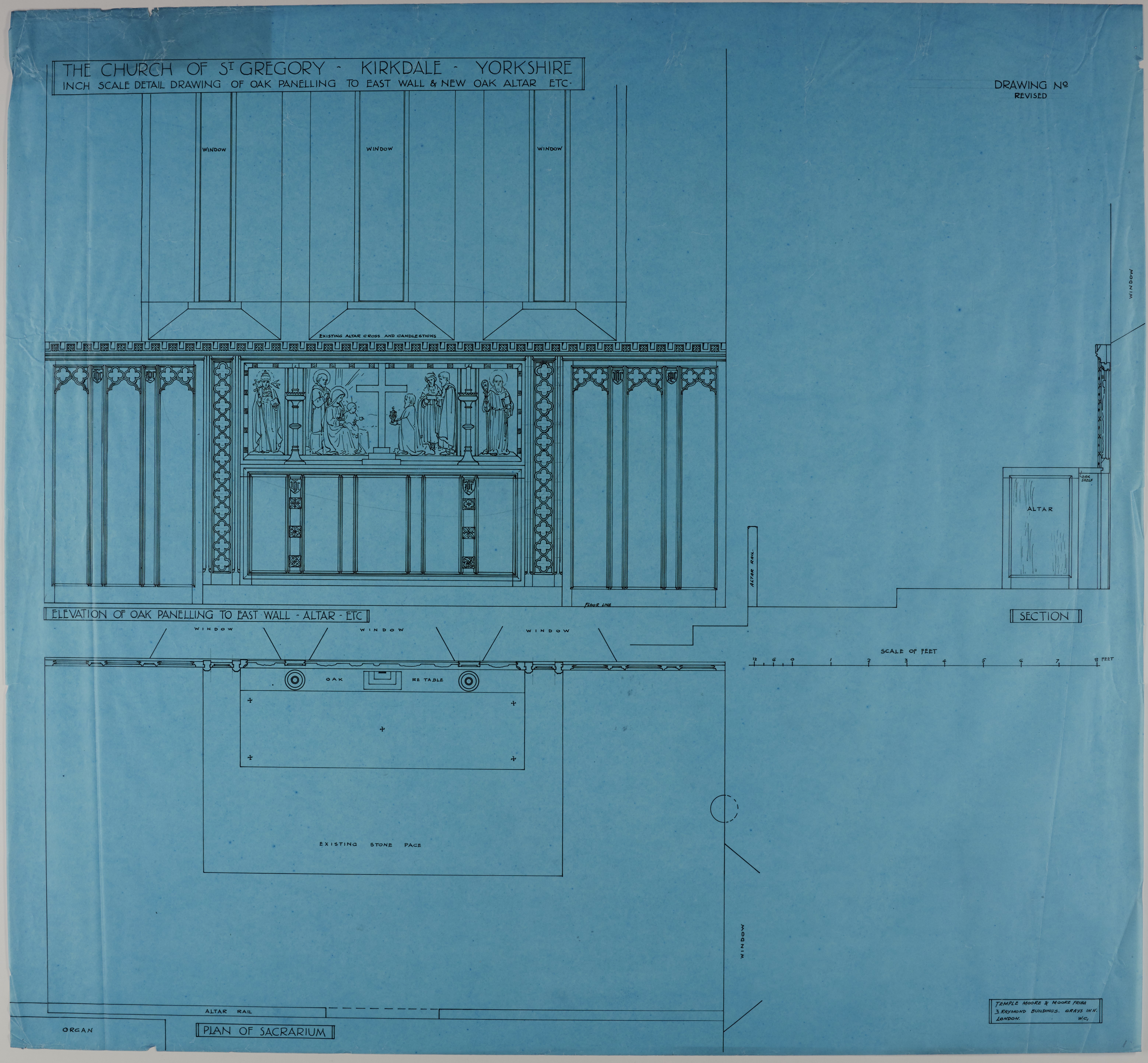 ‘The church of St Gregory, Kirkdale: Inch scale detail drawing of oak panelling to east wall and new oak altar etc’, by Temple Moore & Moore, 3 Raymond Buildings, Grays Inn, London, WC1, undated (c.1919) [PR/KRD 7/4/13]