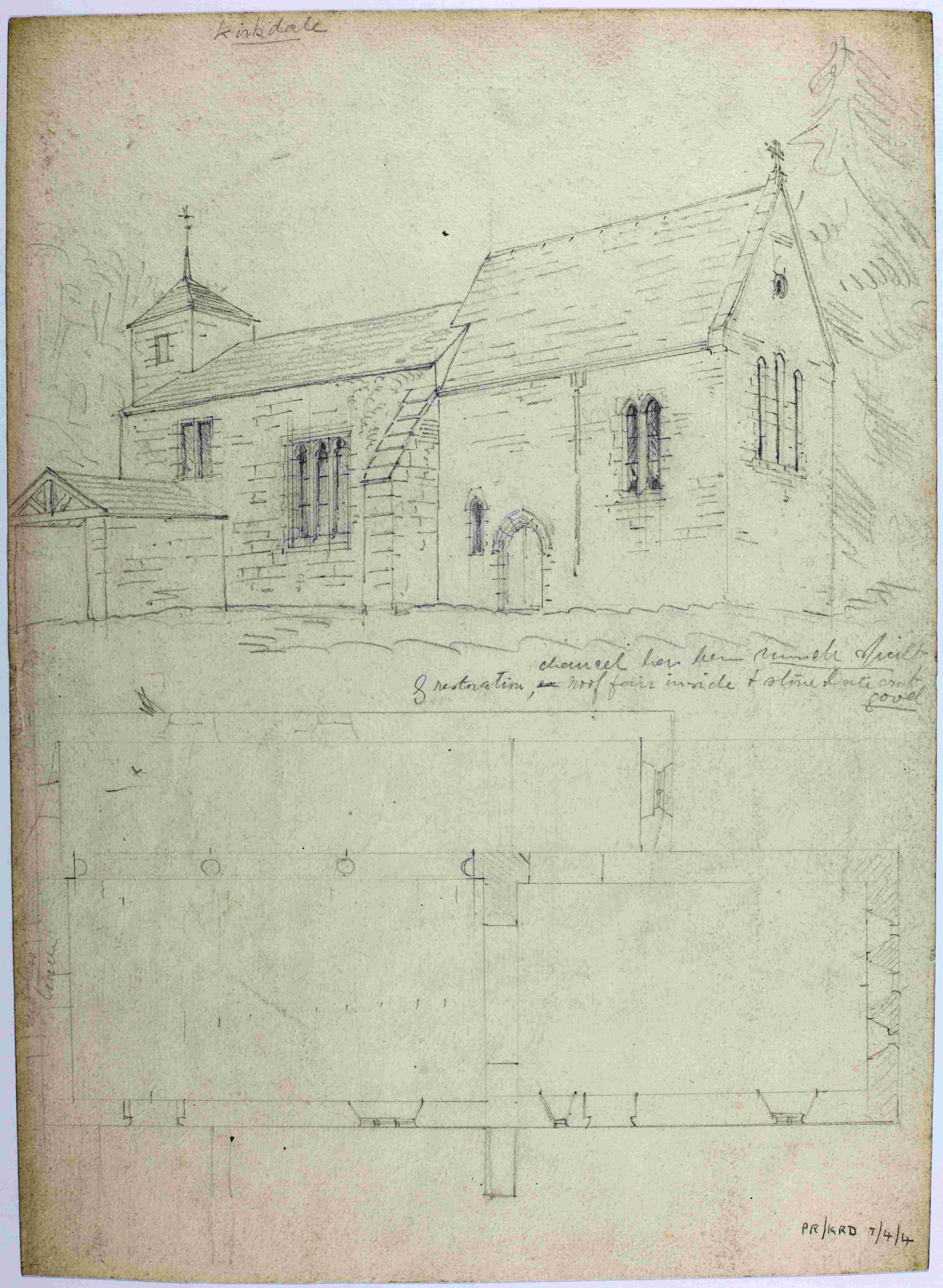 Pencil drawings of Kirkdale church elevation in connection with restoration of chancel, and plan of chancel, unsigned and undated (early-20th century) [PR/KRD 7/4/4-5]