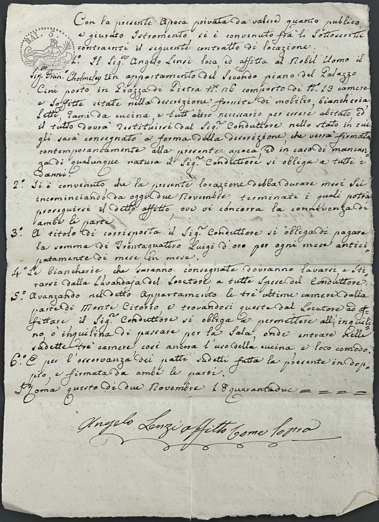 The visiting cards shown above are for Mr Cholmeley at two addresses in Rome: 54 Via delle Mercede and Palazzo Cini, Piazza di Pietra. The contract for the latter lodgings in 1843 can be seen above.