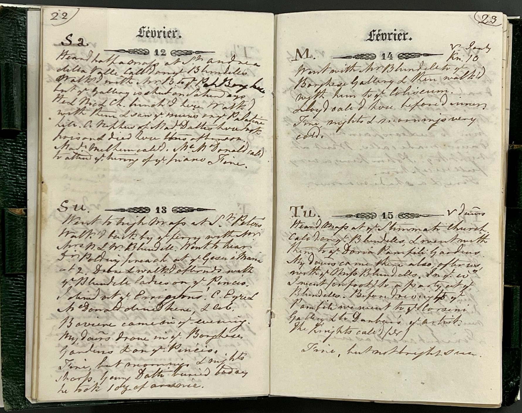 In one example, on Monday 14 February 1842, Francis records “Went with Mr Blundell to the Borghese Gallery & then walked with him to the Coliseum. Lloyd called here before dinner. Fine, nights and mornings very cold” [ZQG X11 12/5/3]. This combination of noting events and activities, along with people he met and observations on the weather is typical of the information recorded in the diaries.