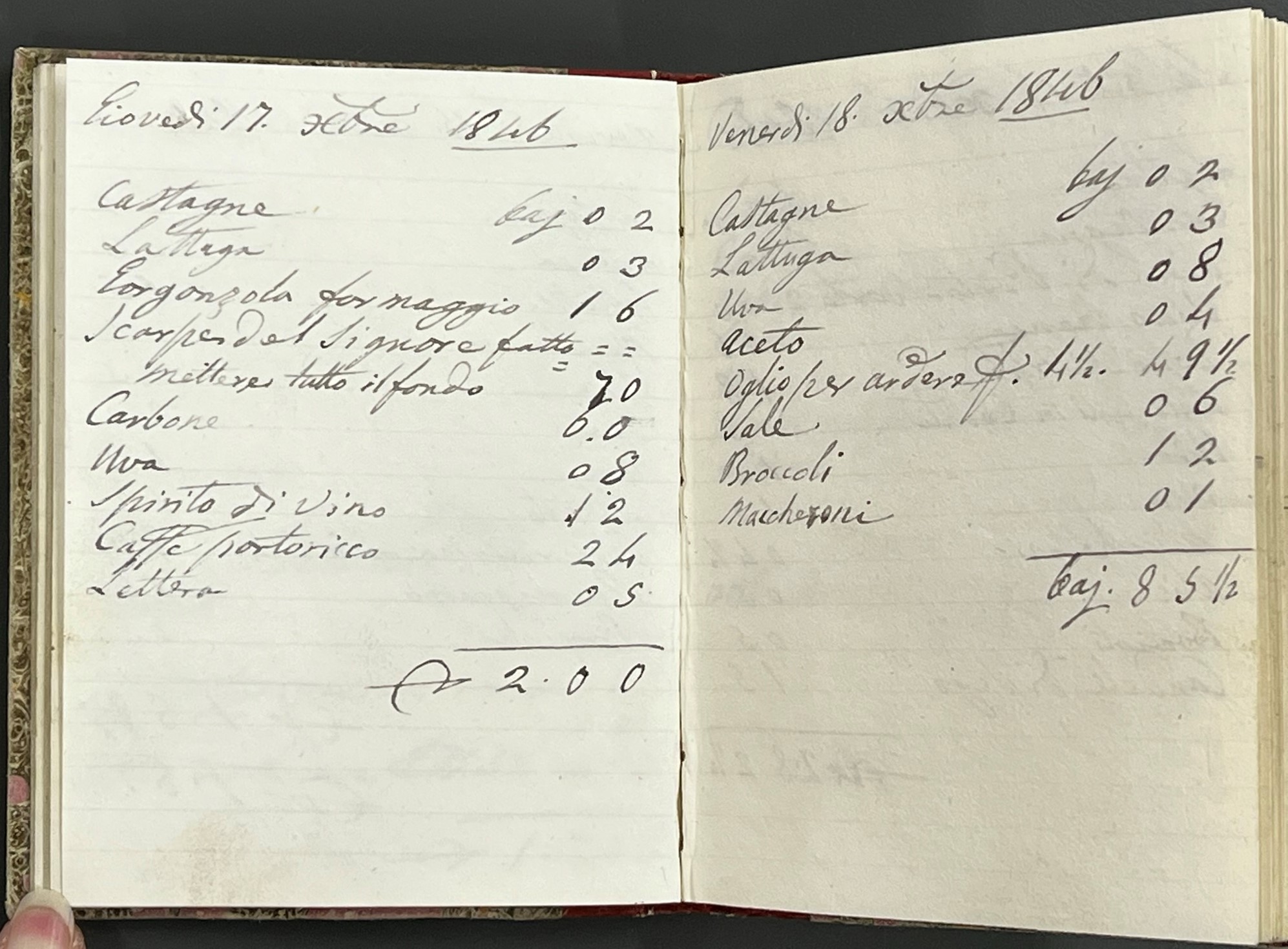 Notebooks containing daily accounts for groceries (written in Italian), 1845-1847: open at pages for 17-18 October 1846 [ZQG X11 12/6/15-17]