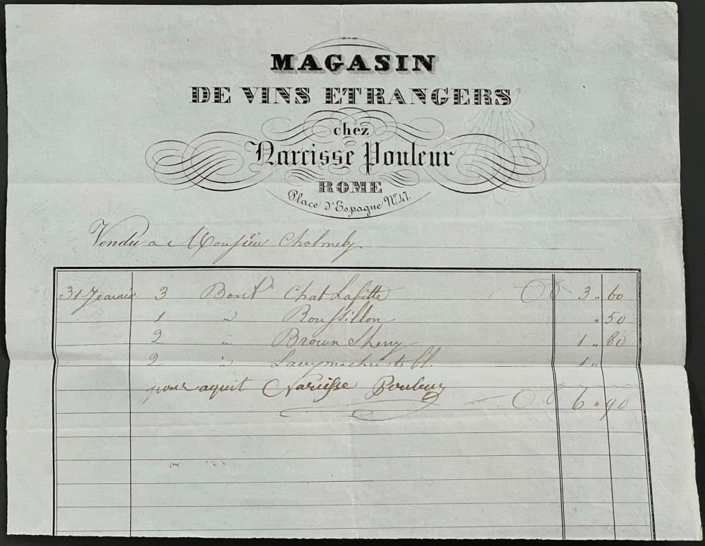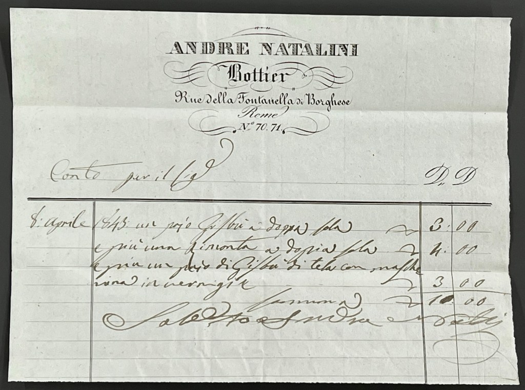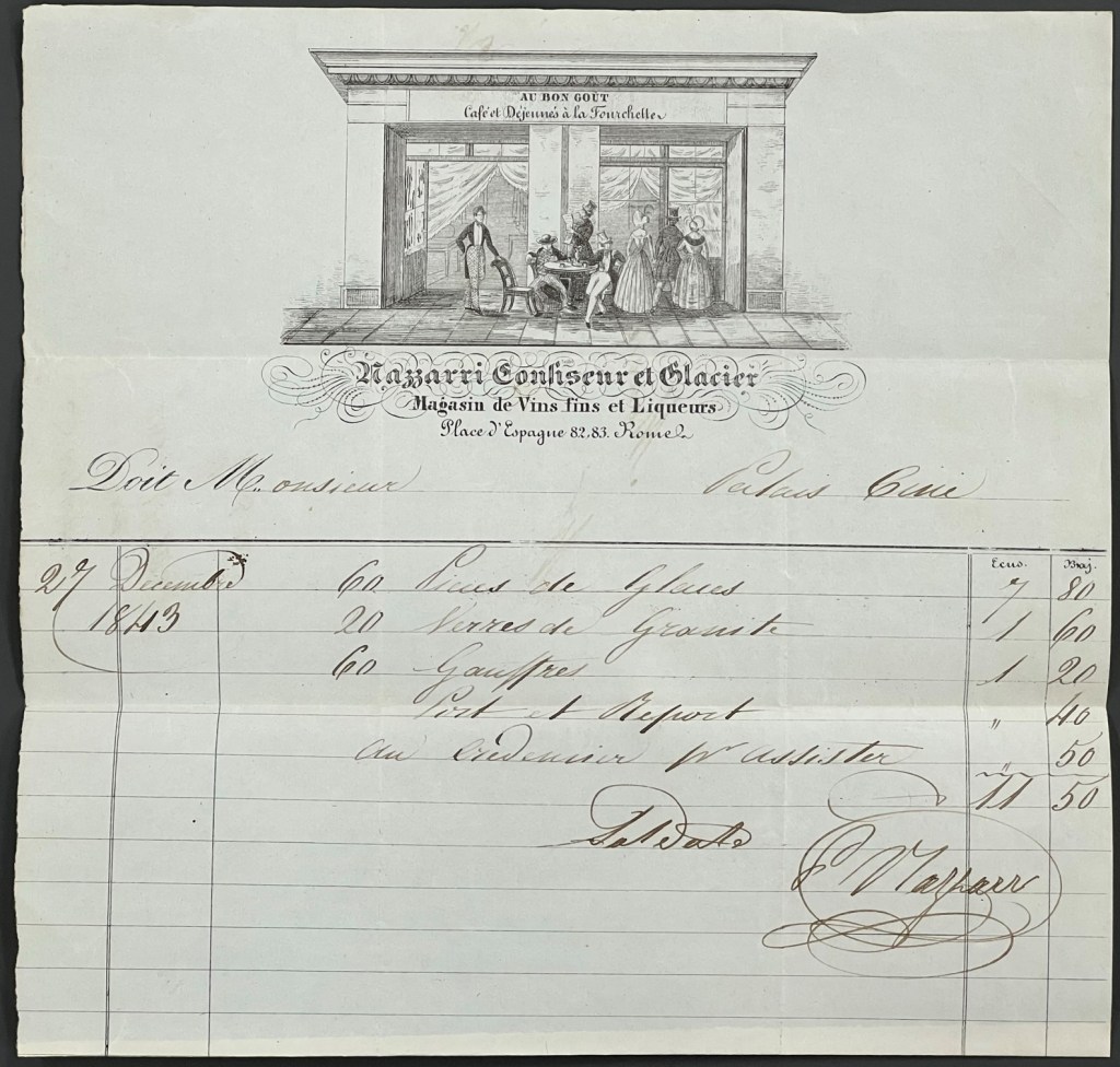 The Cholmeley of Brandsby archive contains a large number of receipts from Francis Cholmeley and his family’s time in Italy. This selection relates to purchases of ice cream, drawing materials, wine, dresses and hats &c.