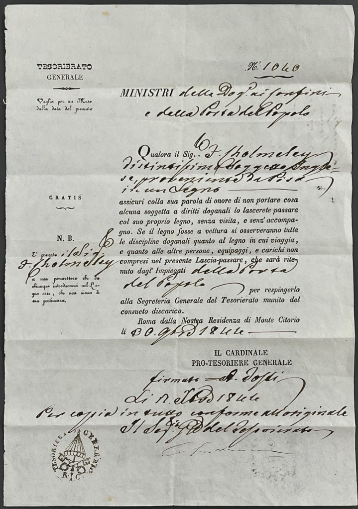Francis Cholmeley’s passport, 1840 with stamps at Paris, Venice and Rome [ZQG X11 12/6/21]