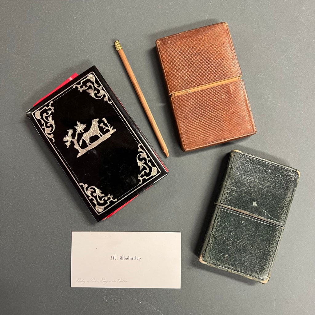 Silver-inlaid black notebook (unused) with pencil, containing visiting cards in side pocket, and another card case with pencil and cards, 1840s [ZQG X11 12/6/34-38]