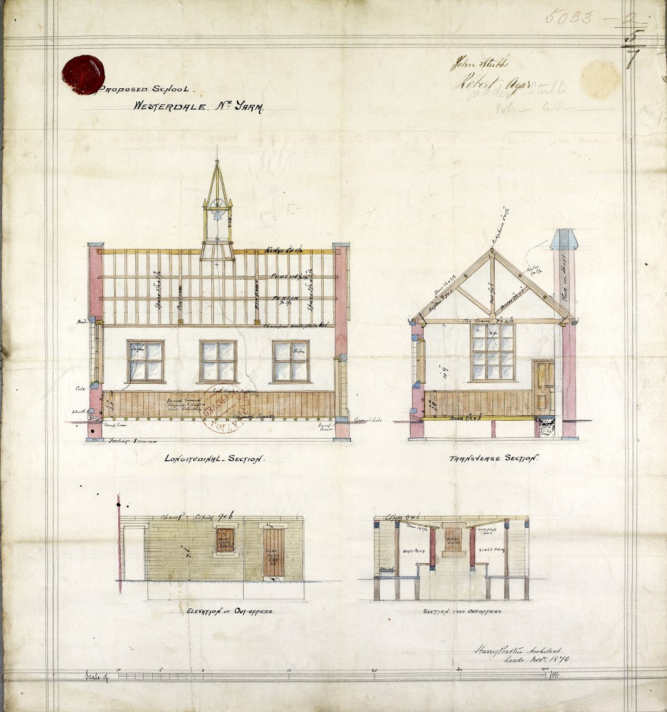 Material relating to schools and school buildings is occasionally to be found in parish record and other collections, such as the examples below of the historic photograph and maps of the estate of Burnt Yates School, Clint, which was built and endowed in 1760 by Rear Admiral Robert Long. The school building is listed Grade II.