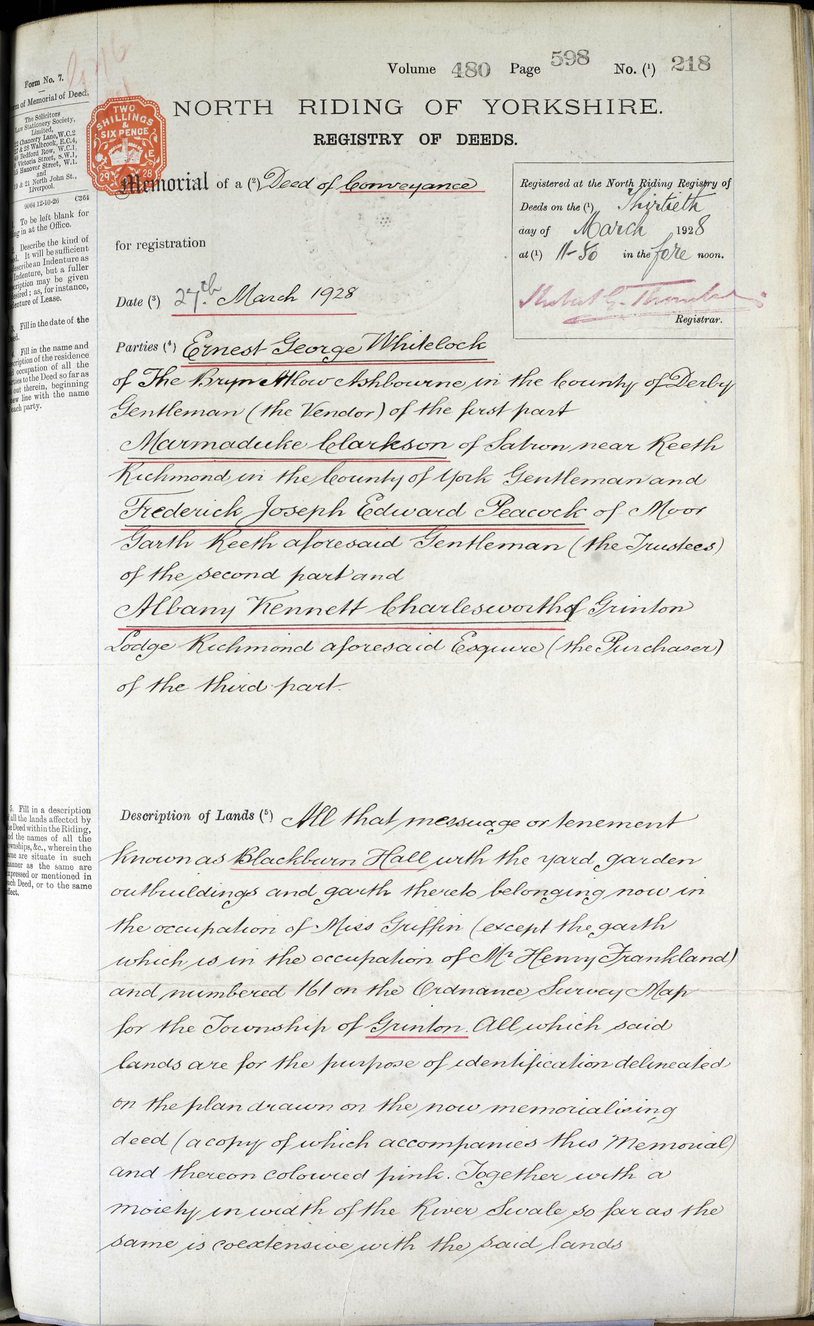 Memorial of a deed of conveyance, with plan, for Blackburn Hall, Grinton, 27 March 1928 (NRRD 480/598/218)