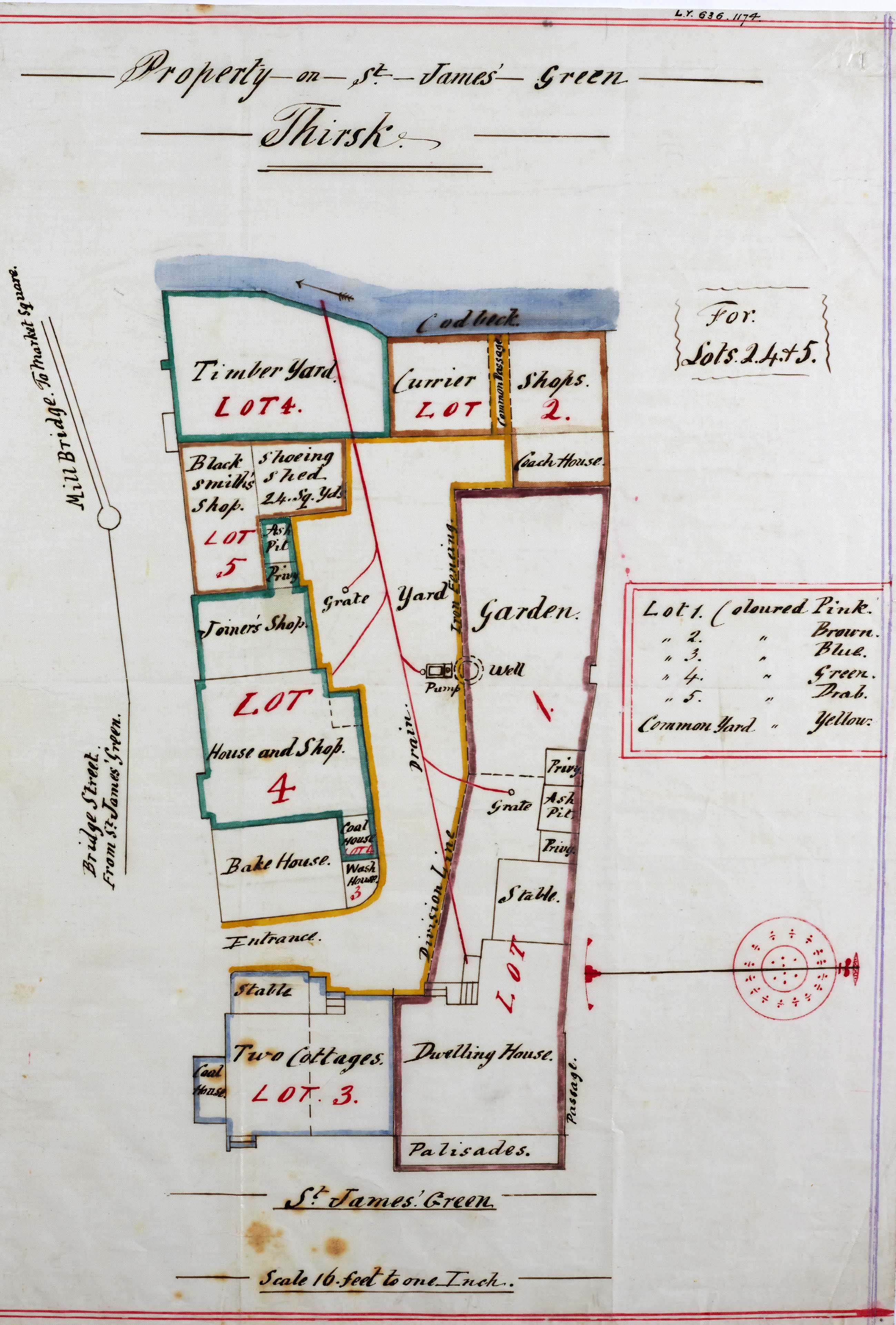 From reading both the entries, you can identify that of the two deeds, deed number 1174 is the one that refers to the property on Millgate (see image above). There is also an accompanying coloured plan, which is rare in the pre-1885 deeds volumes.