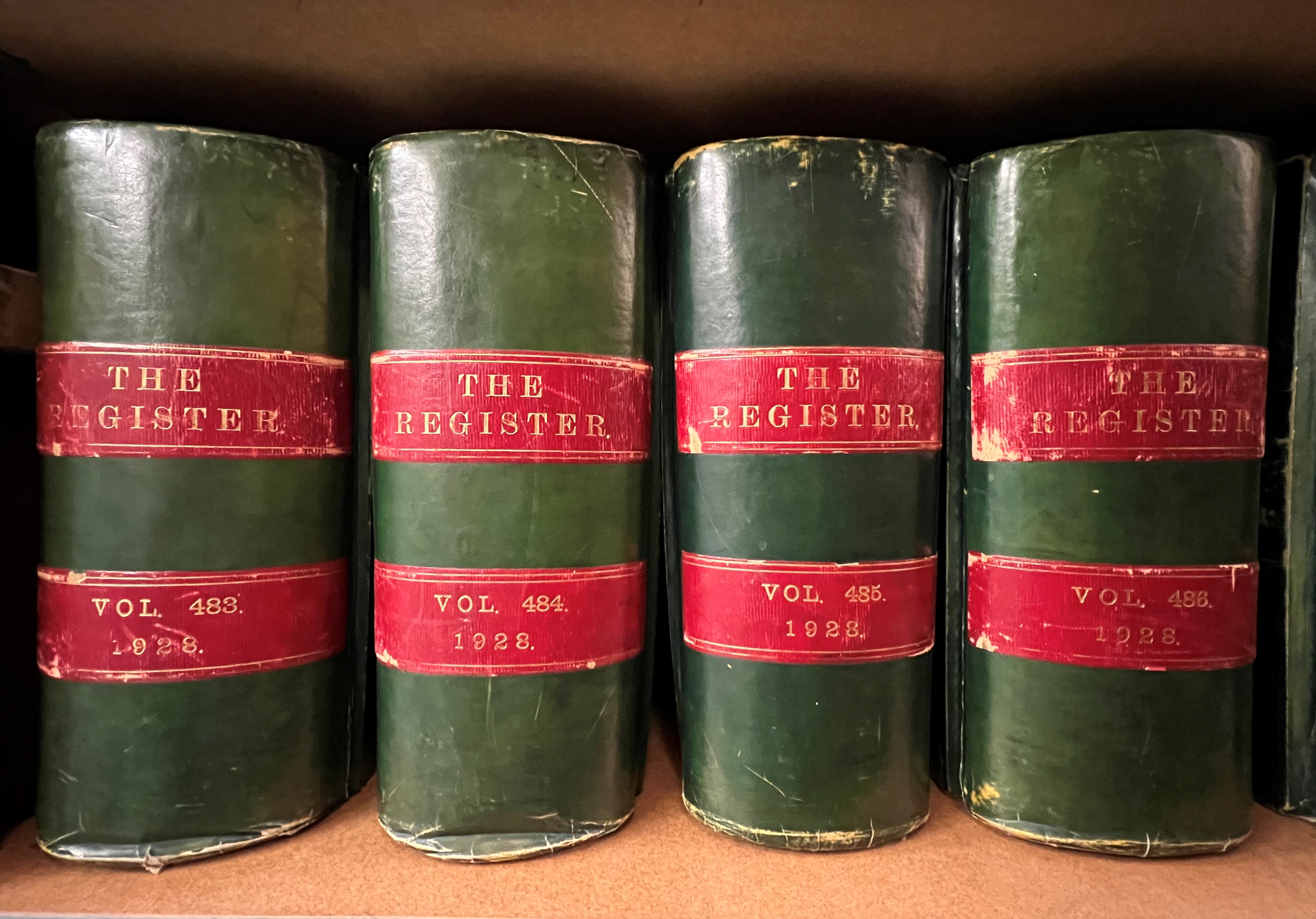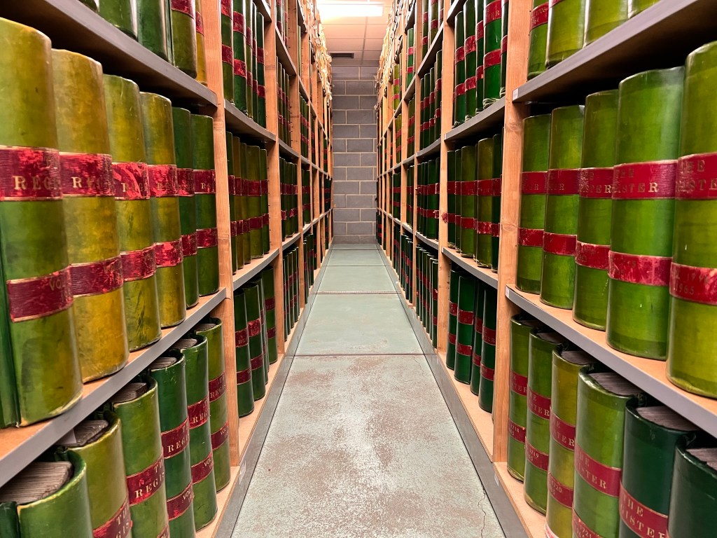 Left to right: index books of names and lands (places) on the search room shelves, with NRRD green-leather-bound deeds volumes for 1928 on Archives store shelves far right.