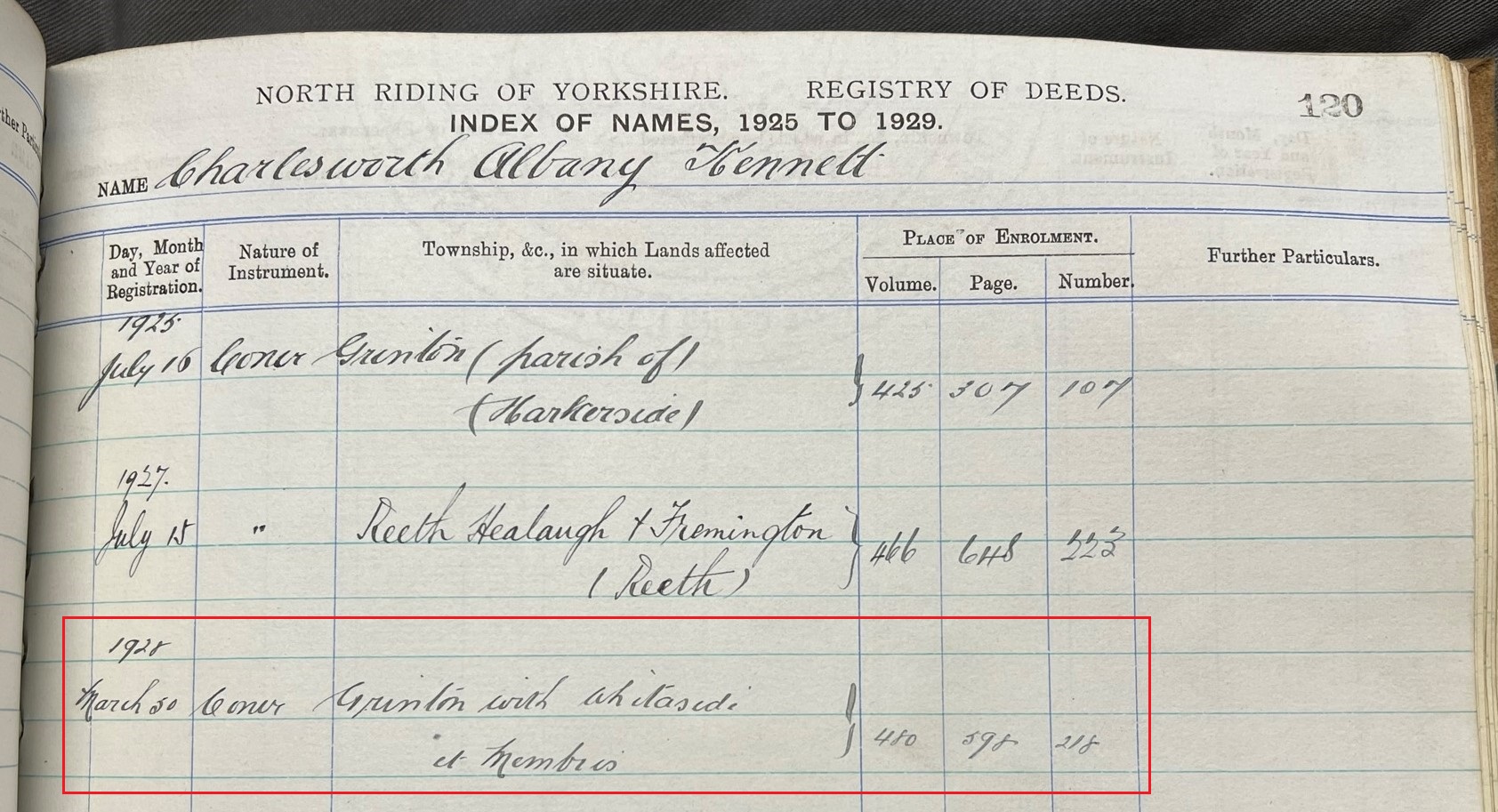 A cross-check can be made with the index of names. The images below show the page for Charlesworth, Albany Kennett, in the names index book for 1925-29 ‘Chape to Claridge’ (the surname is listed before the first and middle names). This shows they were involved in three property transactions in this period. The details in the last of the three entries matches with the places index, with an entry for Grinton with Whitaside et Membris dated 30 March 1928, reference NRRD 480/598/218.