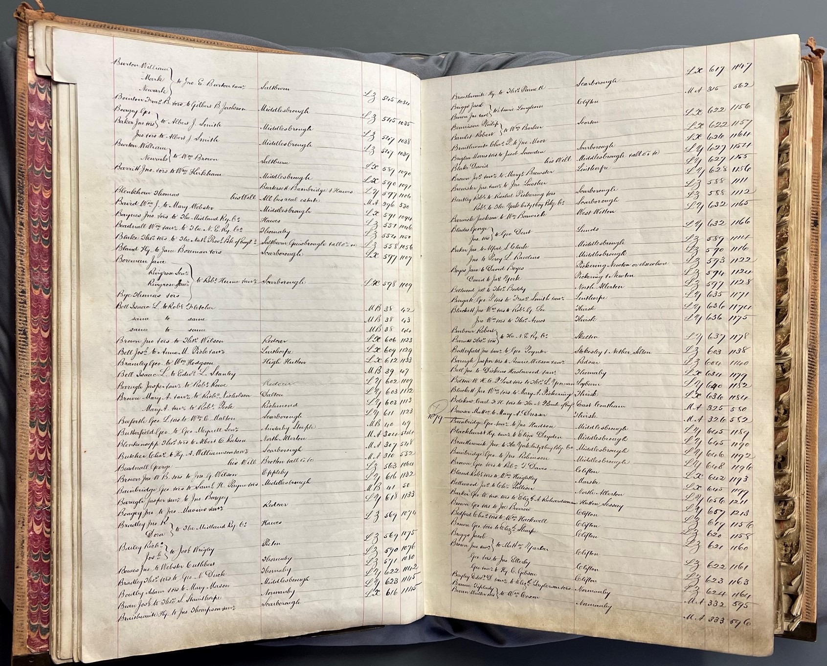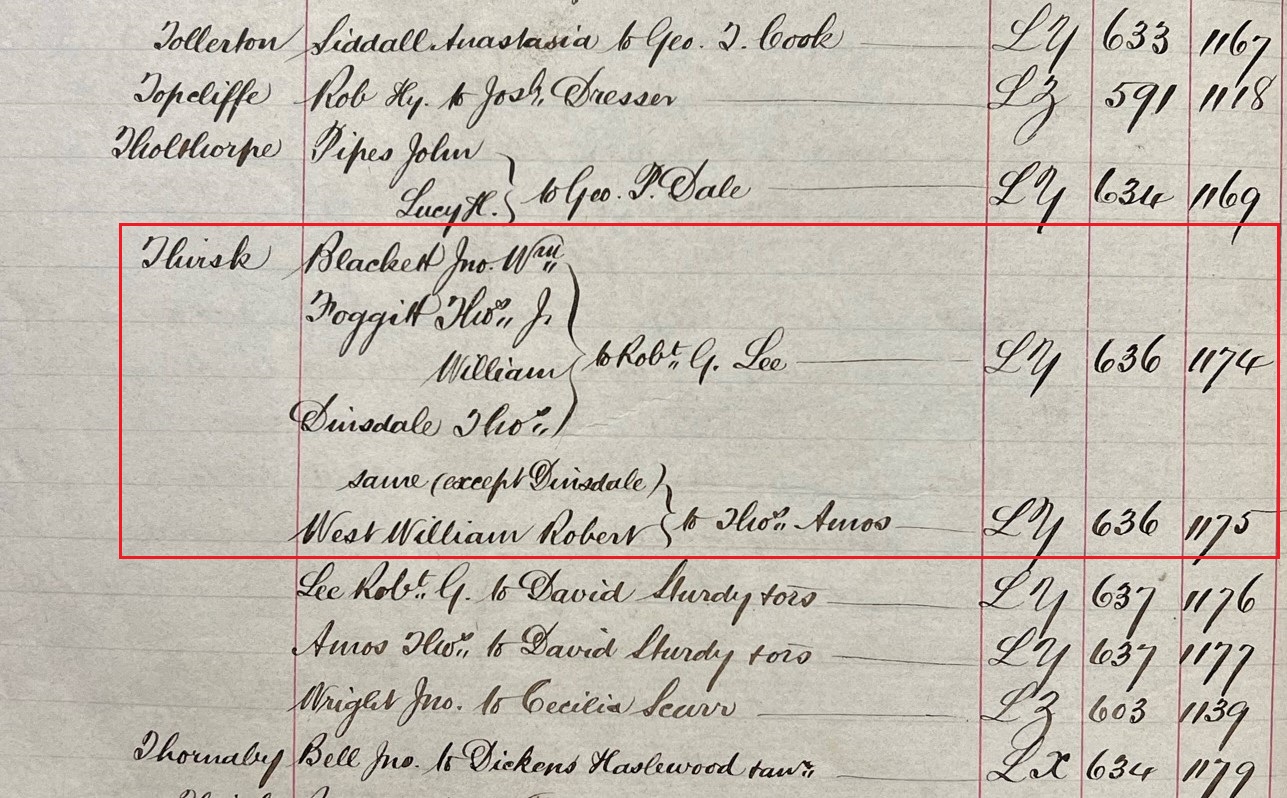 Having located the name Blackett in 1878 (see image highlighted above), the index will give you the details of the volume in which the related deed is held on the far right hand side of the page. In this example, there are two entries for John William Blackett pertaining to property in Thirsk. To be sure which refers to the Millgate property, you will need to consult the deeds themselves.