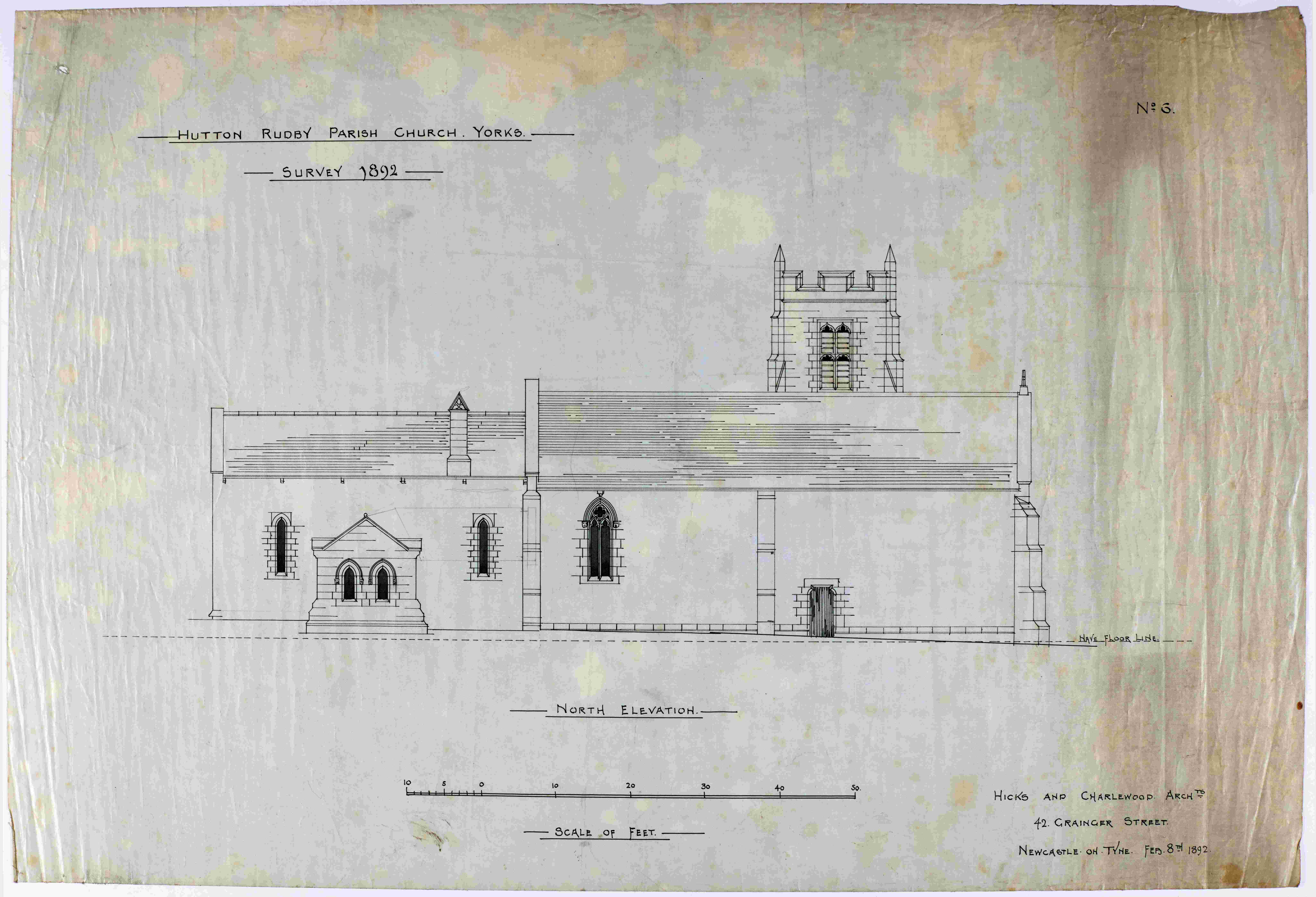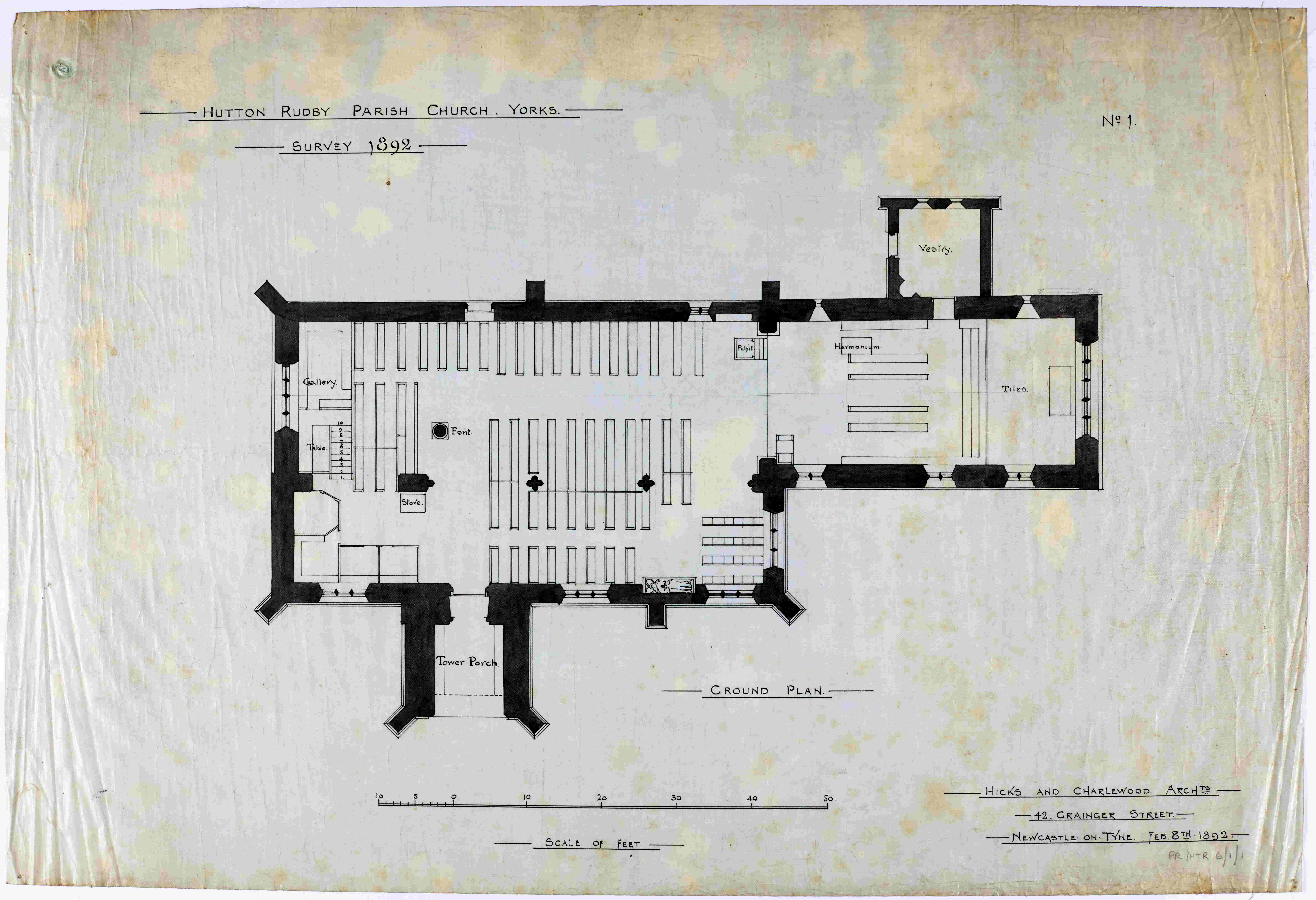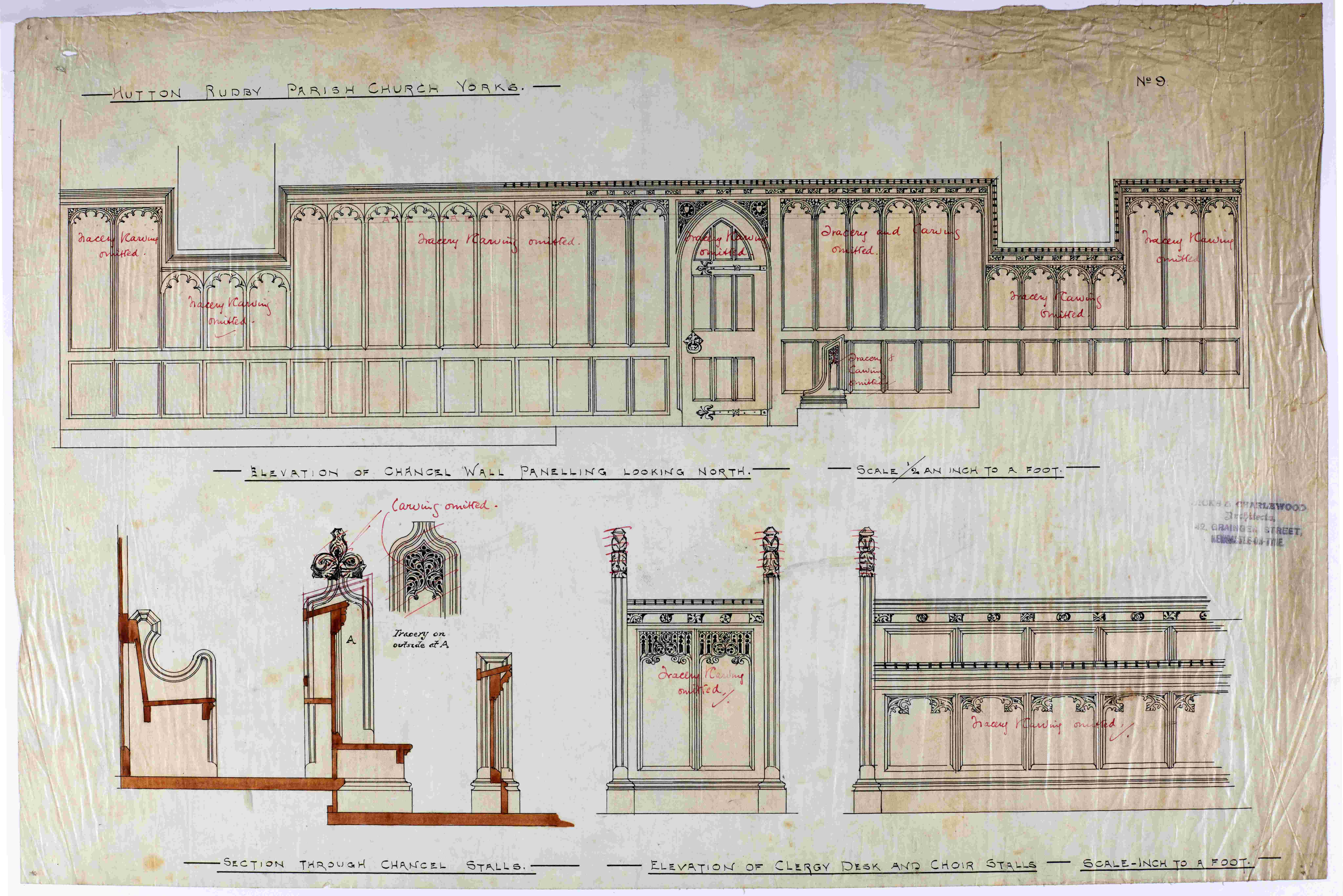 The parish record collection for Hutton Rudby, All Saints contains architectural plans for two phases of church restoration. The earlier of these, in the late-19th century, was designed by Hicks and Charlewood, architects of 42 Grainger Street, Newcastle in 1892 [PR/HTR 6/1]. Thirty years later, a further programme of work was undertaken by Brierley and Rutherford, architects of 13 Lendal, York in December 1922 [PR/HTR 6/6]. An even earlier phase of additions and alterations had previously been carried out at the church in 1867, including works to the vestry to the north and the east window (said to be a copy of the original), although no plans relating to this earliest restoration work survive within the archive.