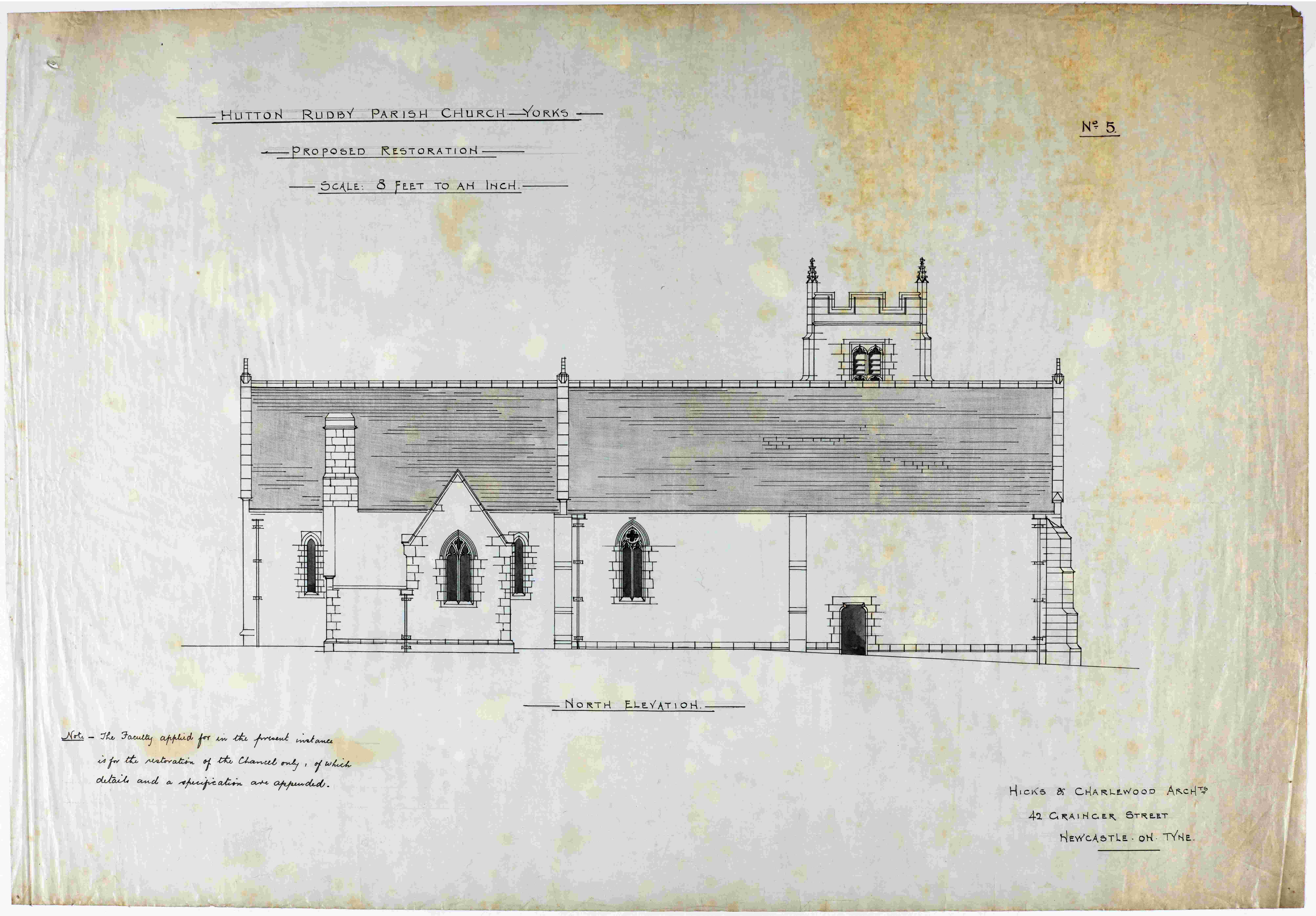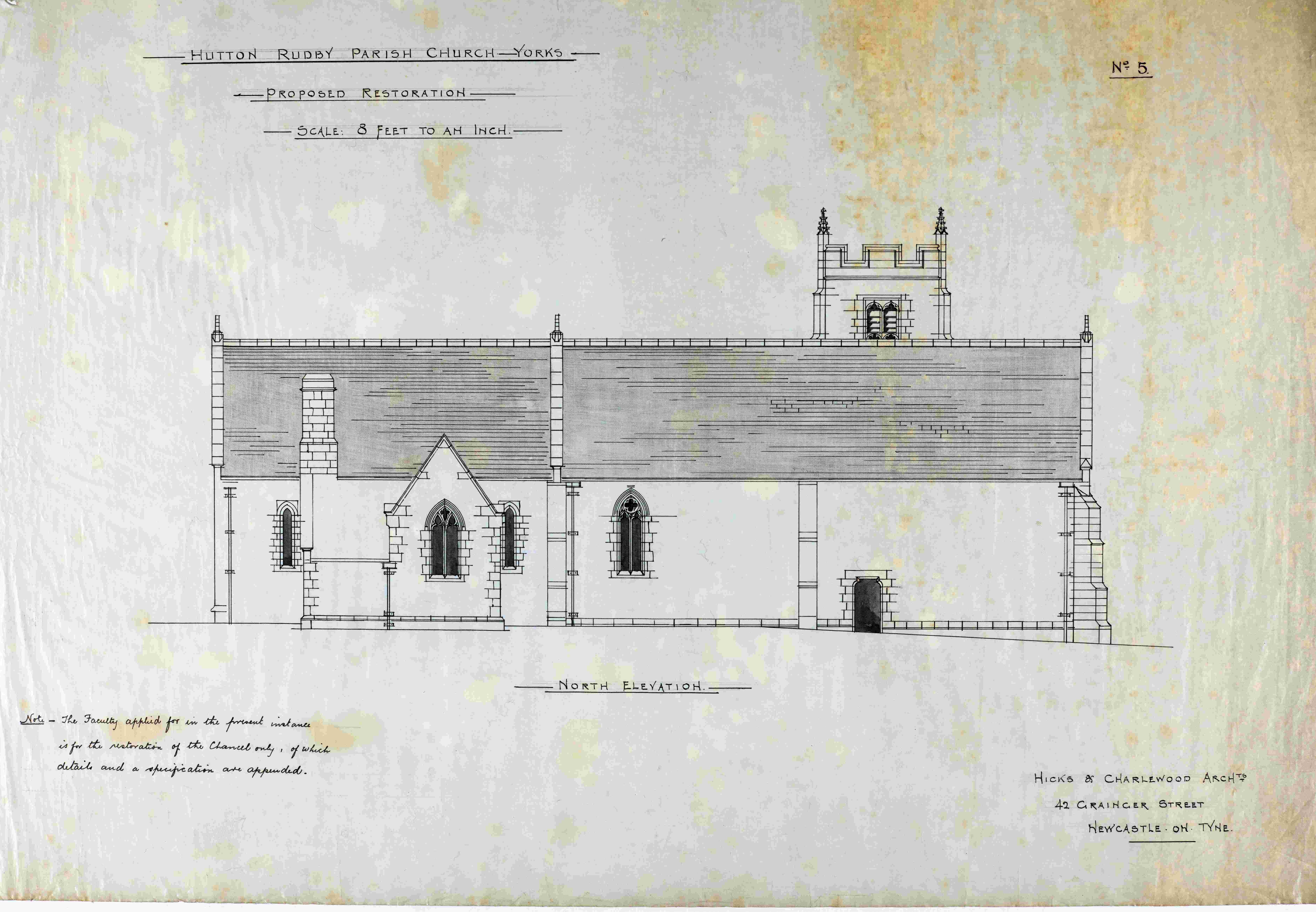 A note written on each of the proposed restoration plans indicates that “The Faculty applied for in the present instance is for the restoration of the chancel only, of which details and a specification are appended.” There are additional drawings of the proposed work to the chancel in the parish record collection, [see below PR/HTR 6/1/3], but no associated written specification or faculty of this date appears to have survived.